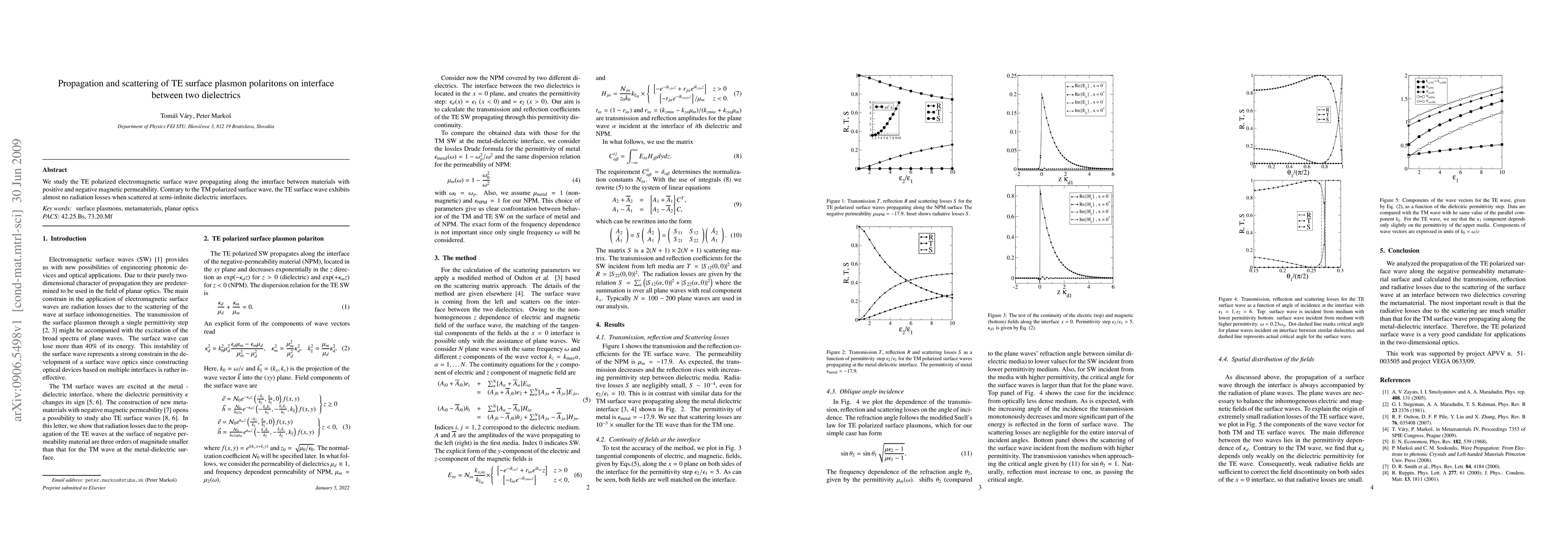 Summary: This study investigates TE polarized surface plasmon polaritons along the interface between materials with differing magnetic permeabilities, revealing minimal radiation losses upon scattering at semi-infinite dielectric interfaces, unlike TM polarized waves.