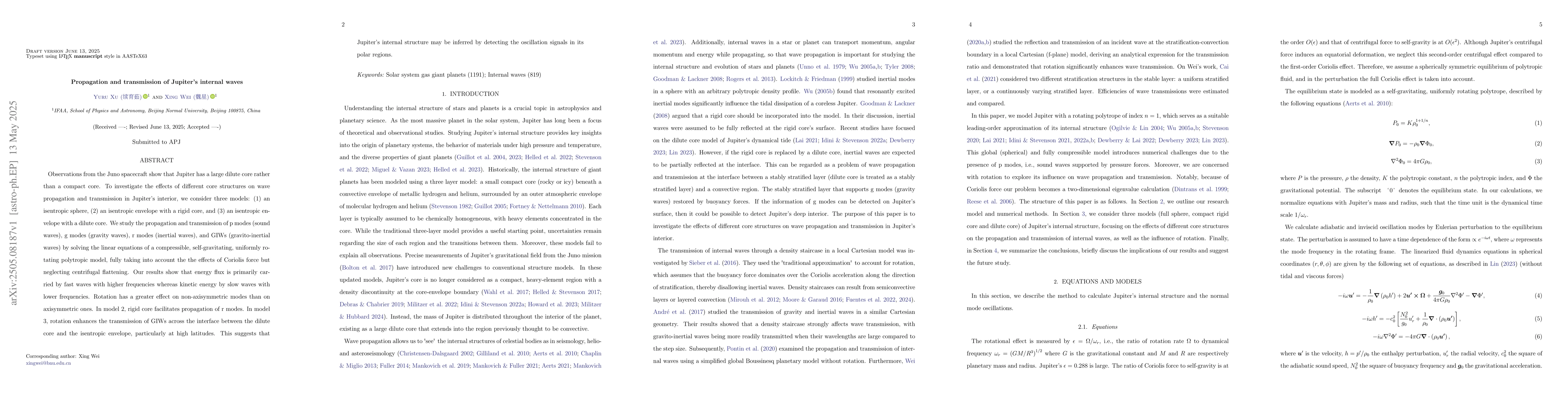 The study investigates wave propagation and transmission in Jupiter's interior using three models: an isentropic sphere, an isentropic envelope with a rigid core, and an isentropic envelope with a dilute core. It considers p modes, g modes, r modes, and GIWs, solving the linear equations of a compressible, self-gravitating, uniformly rotating polytropic model, accounting for the Coriolis force but neglecting centrifugal flattening.