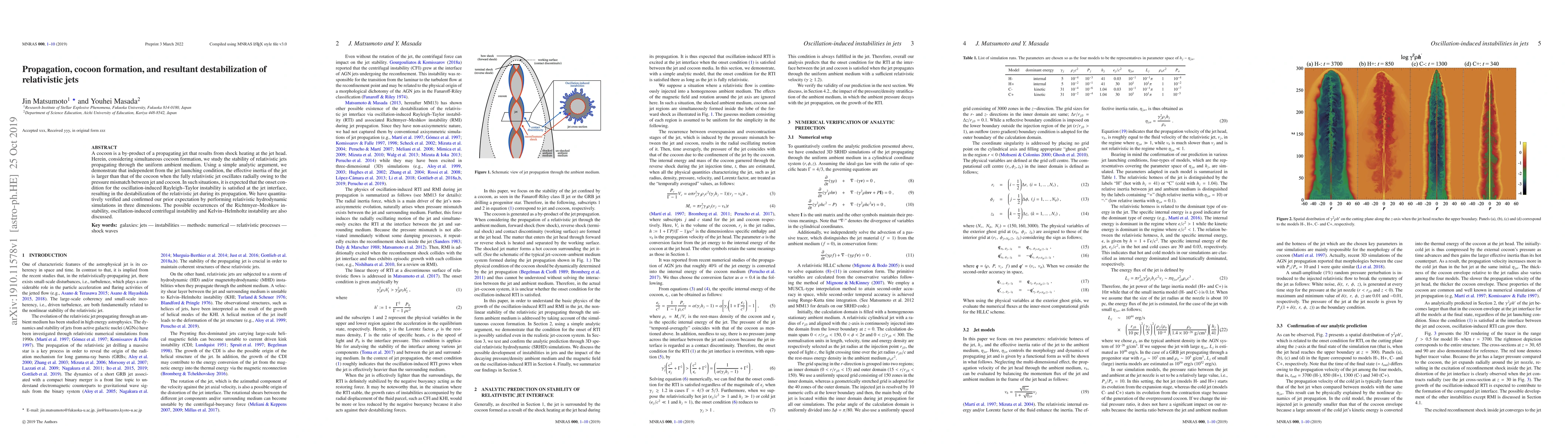 This paper investigates the stability of relativistic jets as they propagate through a uniform medium, focusing on the formation of cocoons and their impact on jet stability. The study finds that the jet's effective inertia exceeds that of the cocoon, leading to oscillations and the onset of Rayleigh-Taylor instability at the jet-cocoon interface, destabilizing the jet. This conclusion is supported by three-dimensional relativistic hydrodynamic simulations.