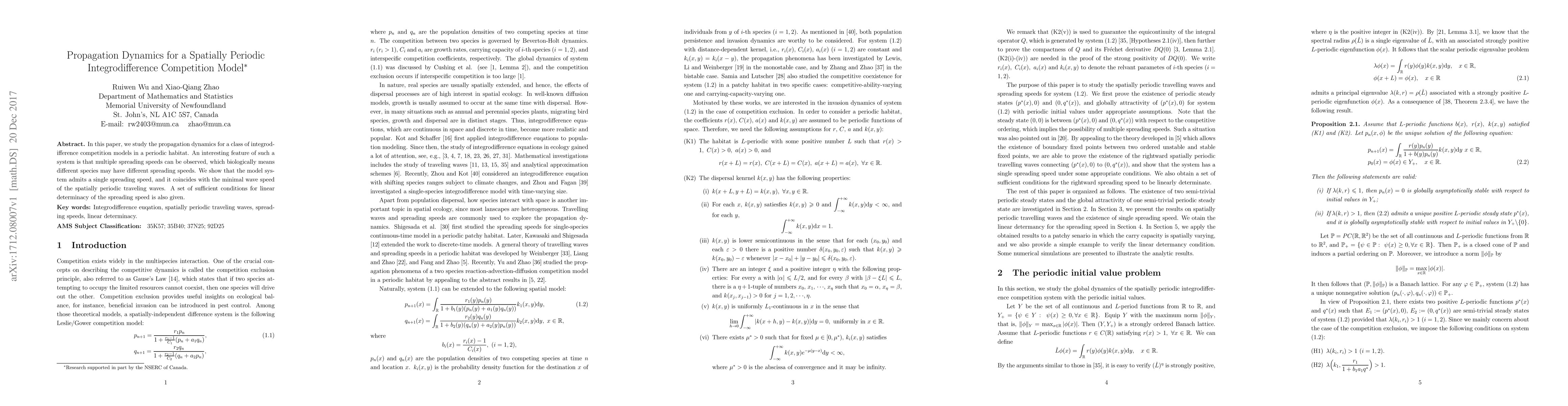 This paper investigates the propagation dynamics of integrodifference competition models in a spatially periodic habitat, revealing that despite multiple species, the system exhibits a single spreading speed. The spreading speed is shown to be the minimal wave speed of periodic traveling waves, with sufficient conditions for its linear determinacy provided.