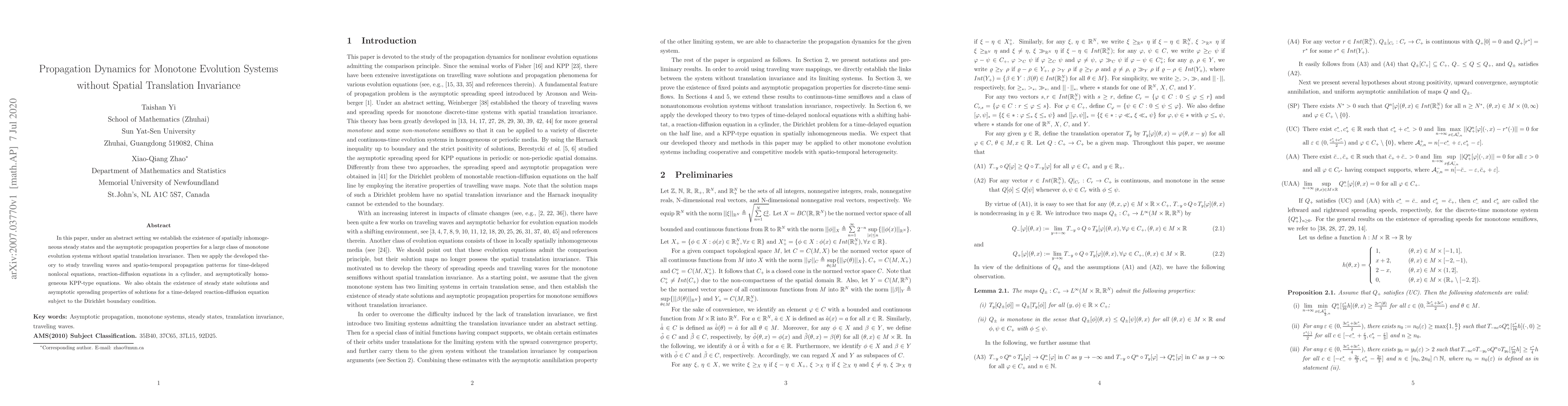 In this paper,under an abstract setting we establish the existence of spatially inhomogeneous steady states and the asymptotic propagation properties for a large class of monotone evolution systems without spatial translation invariance. Then we apply the developed theory to study traveling waves and spatio-temporal propagation patterns for time-delayed nonlocal equations, reaction-diffusion equations in a cylinder, and asymptotically homogeneous KPP-type equations. We also obtain the existence of steady state solutions and asymptotic spreading properties of solutions for a time-delayed reaction-diffusion equation subject to the Dirichlet boundary condition.
