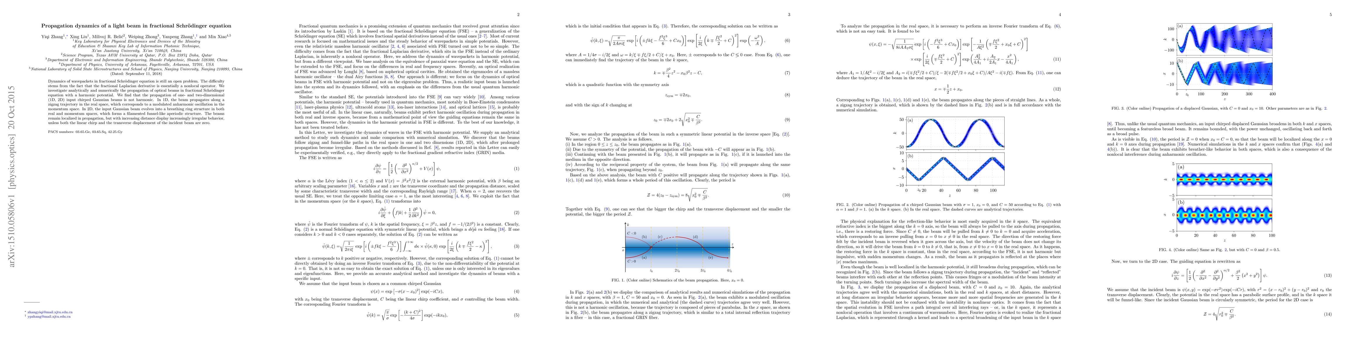Dynamics of wavepackets in fractional Schrodinger equation is still an open problem. The difficulty stems from the fact that the fractional Laplacian derivative is essentially a nonlocal operator. We investigate analytically and numerically the propagation of optical beams in fractional Schr\"odinger equation with a harmonic potential. We find that the propagation of one- and two-dimensional (1D, 2D) input chirped Gaussian beams is not harmonic. In 1D, the beam propagates along a zigzag trajectory in the real space, which corresponds to a modulated anharmonic oscillation in the momentum space. In 2D, the input Gaussian beam evolves into a breathing ring structure in both real and momentum spaces, which forms a filamented funnel-like aperiodic structure. The beams remain localized in propagation, but with increasing distance display increasingly irregular behavior, unless both the linear chirp and the transverse displacement of the incident beam are zero.
