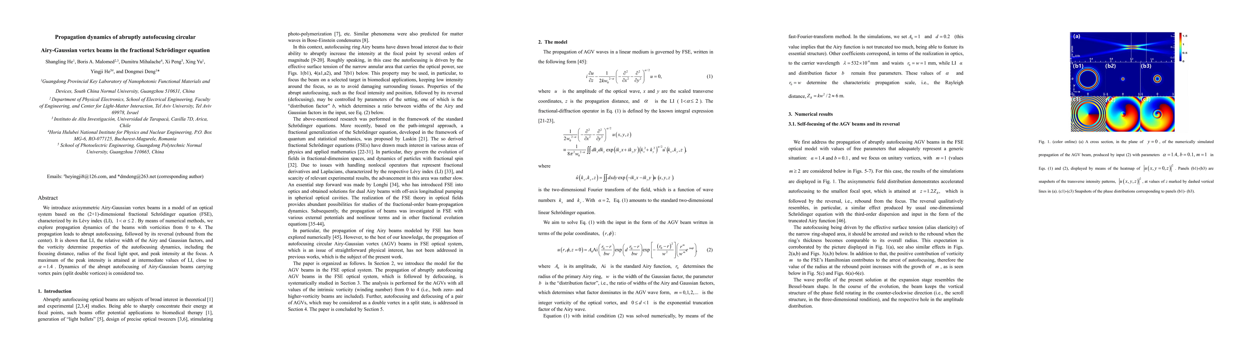This paper investigates the propagation dynamics of Airy-Gaussian vortex beams in a fractional Schrödinger equation, revealing abrupt autofocusing and its reversal. The study finds that the L\'evy index, beam width, and vorticity influence focusing properties, with peak intensity maximized near LI=1.4.
