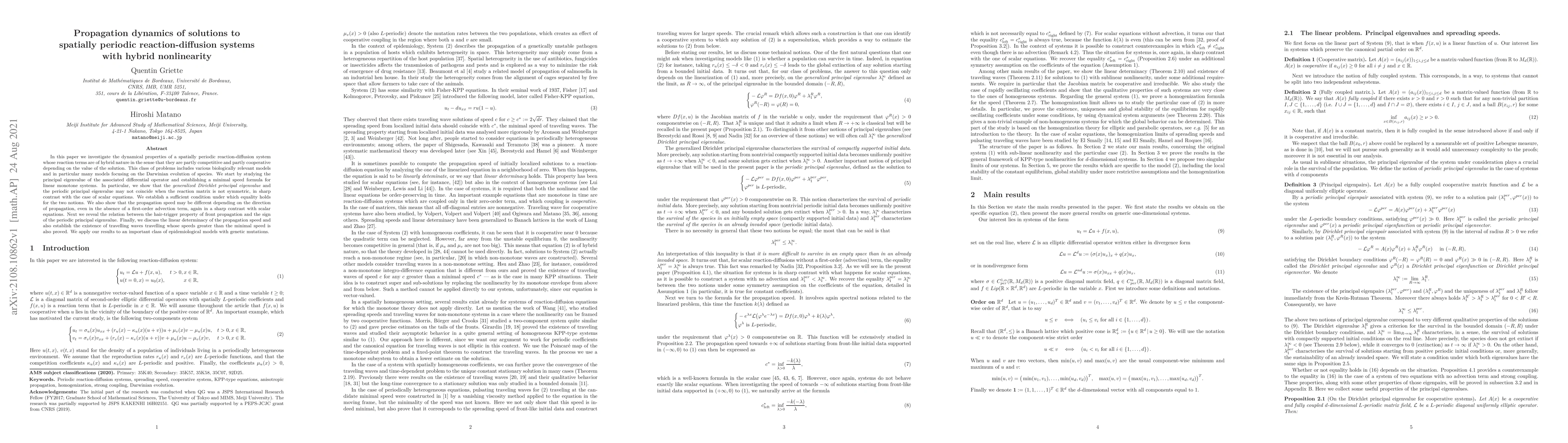 In this paper we investigate the dynamical properties of a spatially periodic reaction-diffusion system {whose reaction terms are of hybrid nature in the sense that they are partly competitive and partly cooperative depending on the value of the solution. This class of problems includes various biologically relevant models and in particular many models focusing on the Darwinian evolution of species. We start by studying the principal eigenvalue of the associated differential operator and establishing a minimal speed formula for linear monotone systems. In particular, we show that the generalized Dirichlet principal eigenvalue and the periodic principal eigenvalue may not coincide when the reaction matrix is not symmetric, in sharp contrast with the case of scalar equations. We establish a sufficient condition under which equality holds for the two notions. We also show that the propagation speed may be different depending on the direction of propagation, even in the absence of a first-order advection term, again in a sharp contrast with scalar equations. Next we reveal the relation between the hair-trigger property of front propagation and the sign of the periodic principal eigenvalue. Finally, we discuss the linear determinacy of the propagation speed and also establish the existence of travelling waves travelling whose speeds greater than the minimal speed is also proved. We apply our results to an important class of epidemiological models with genetic mutations.