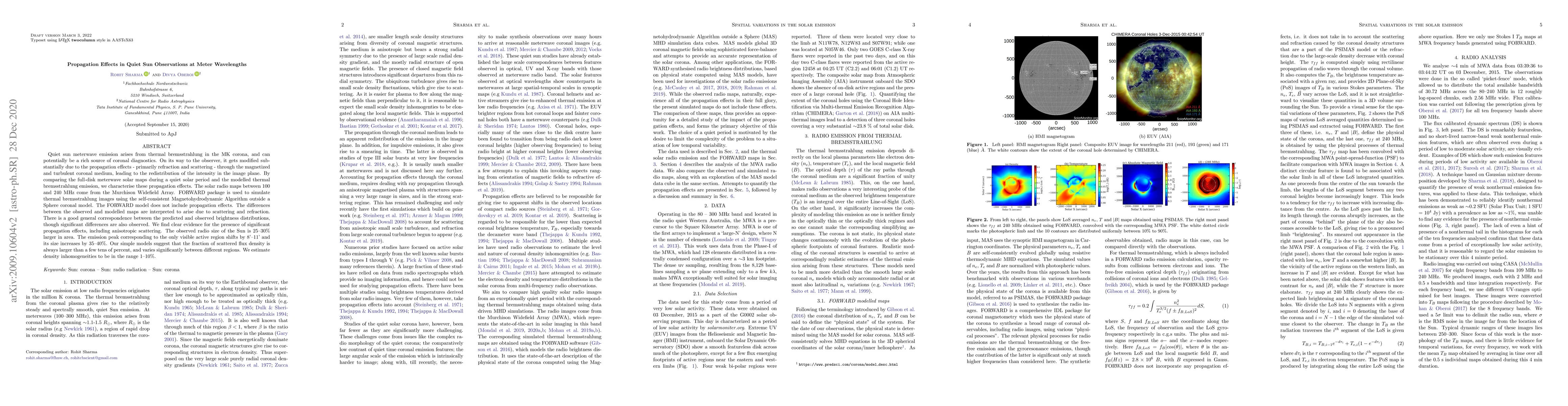 This paper investigates the propagation effects of quiet sun meterwave emissions, revealing significant modifications due to refraction and scattering in the coronal medium. The study finds that the observed radio size of the Sun is 25-30% larger, with notable shifts and size increases in active regions, indicating anisotropic scattering and density inhomogeneities of 1-10%.