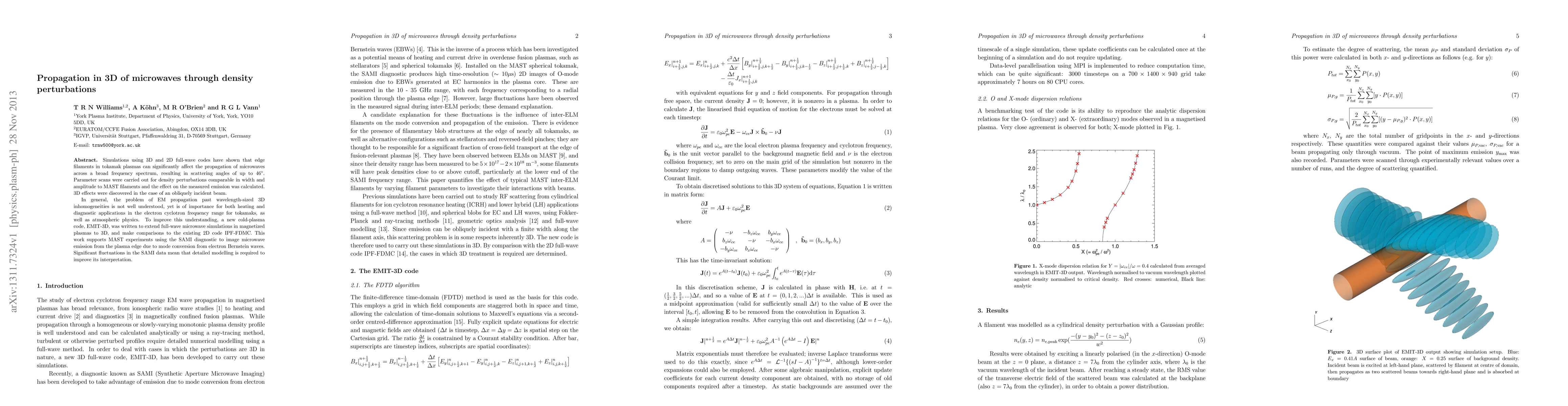 Simulations using 3D and 2D full-wave codes have shown that edge filaments in tokamak plasmas can significantly affect the propagation of microwaves across a broad frequency spectrum, resulting in scattering angles of up to 46 degrees. Parameter scans were carried out for density perturbations comparable in width and amplitude to MAST filaments and the effect on the measured emission was calculated. 3D effects were discovered in the case of an obliquely incident beam. In general, the problem of EM propagation past wavelength-sized 3D inhomogeneities is not well understood, yet is of importance for both heating and diagnostic applications in the electron cyclotron frequency range for tokamaks, as well as atmospheric physics. To improve this understanding, a new cold-plasma code, EMIT-3D, was written to extend full-wave microwave simulations in magnetized plasmas to 3D, and make comparisons to the existing 2D code IPF-FDMC. This work supports MAST experiments using the SAMI diagnostic to image microwave emission from the plasma edge due to mode conversion from electron Bernstein waves. Significant fluctuations in the SAMI data mean that detailed modelling is required to improve its interpretation.