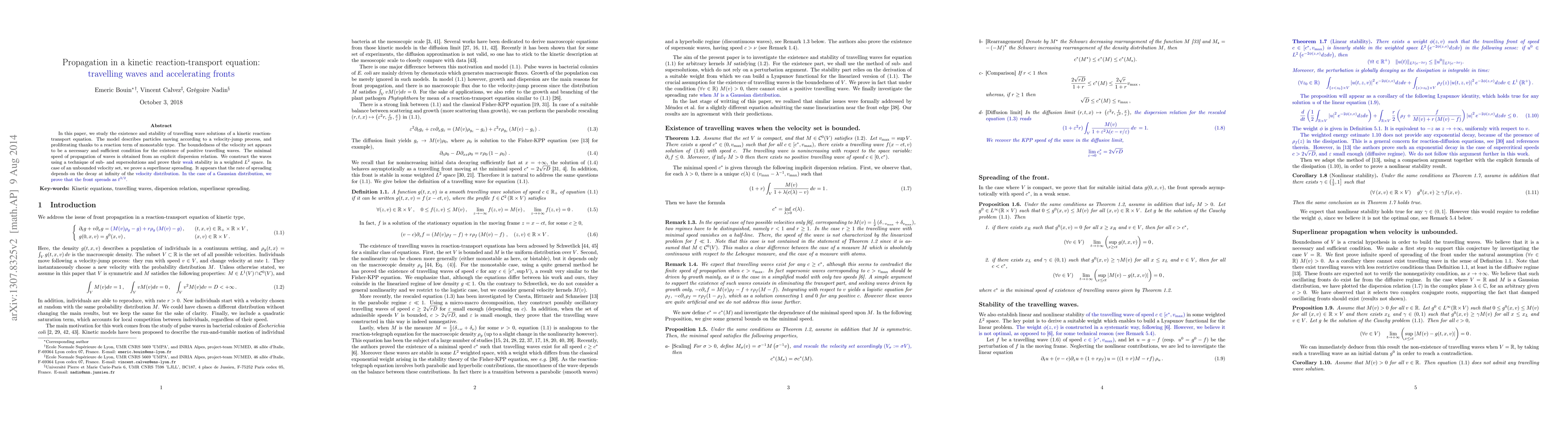 In this paper, we study the existence and stability of travelling wave solutions of a kinetic reaction-transport equation. The model describes particles moving according to a velocity-jump process, and proliferating thanks to a reaction term of monostable type. The boundedness of the velocity set appears to be a necessary and sufficient condition for the existence of positive travelling waves. The minimal speed of propagation of waves is obtained from an explicit dispersion relation. We construct the waves using a technique of sub- and supersolutions and prove their \eb{weak} stability in a weighted $L^2$ space. In case of an unbounded velocity set, we prove a superlinear spreading. It appears that the rate of spreading depends on the decay at infinity of the velocity distribution. In the case of a Gaussian distribution, we prove that the front spreads as $t^{3/2}$.