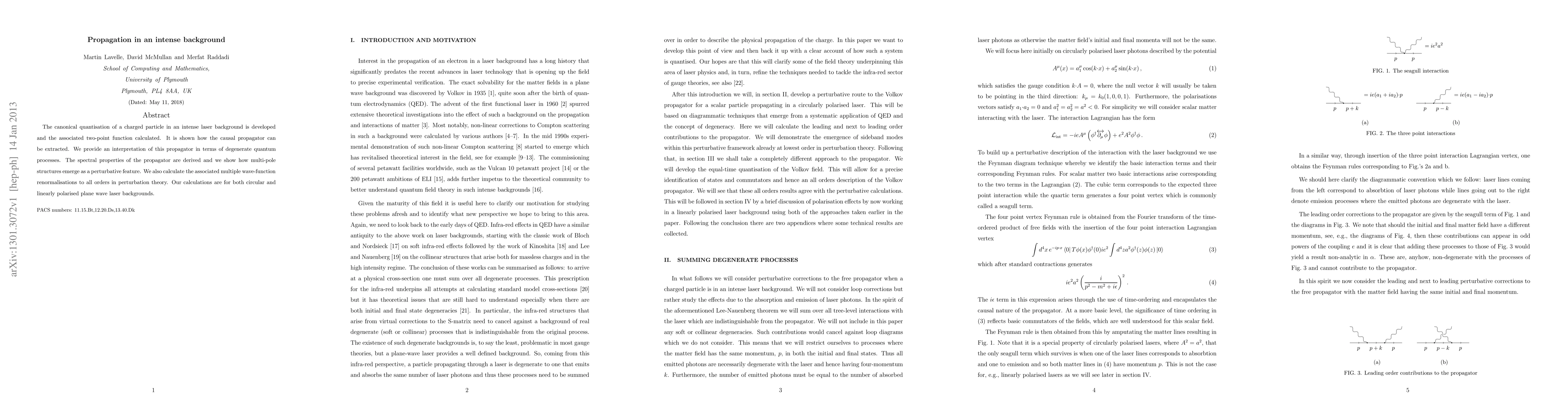 The canonical quantisation of a charged particle in an intense laser background is developed and the associated two-point function calculated. It is shown how the causal propagator can be extracted. We provide an interpretation of this propagator in terms of degenerate quantum processes. The spectral properties of the propagator are derived and we show how multi-pole structures emerge as a perturbative feature. We also calculate the associated multiple wave-function renormalisations to all orders in perturbation theory. Our calculations are for both circular and linearly polarised plane wave laser backgrounds.