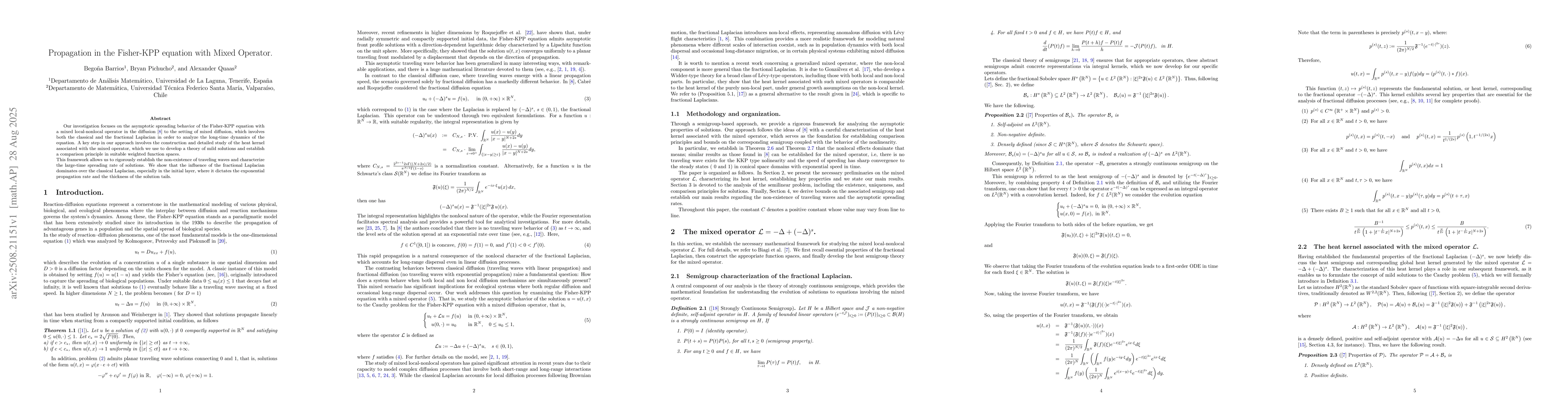 Our investigation focuses on the asymptotic spreading behavior of the Fisher-KPP equation with a mixed local-nonlocal operator in the diffusion (see the work by X. Cabr\'e and J.-M. Roquejoffre, 2013, ref.[8]) to the setting of mixed diffusion, which involves both the classical and the fractional Laplacian in order to analyze the long-time dynamics of the equation. A key step in our approach involves the construction and detailed study of the heat kernel associated with the mixed operator, which we use to develop a theory of mild solutions and establish a comparison principle in suitable weighted function spaces. This framework allows us to rigorously establish the non-existence of traveling waves and characterize the large-time spreading rate of solutions. We show that the influence of the fractional Laplacian dominates over the classical Laplacian, especially in the initial layer, where it dictates the exponential propagation rate and the thickness of the solution tails.