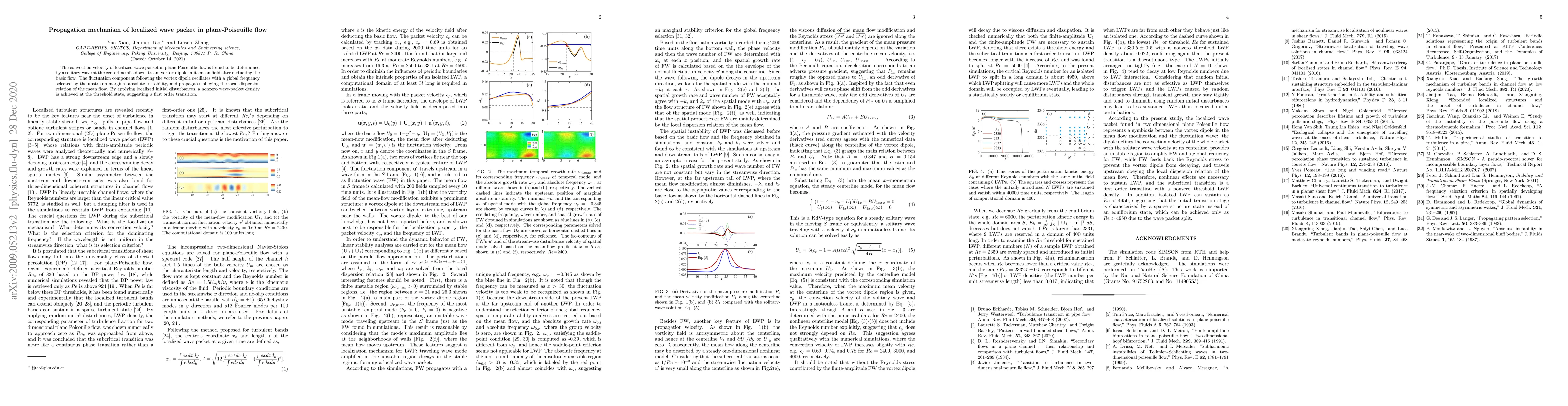 Summary: The study reveals that localized wave packets in plane-Poiseuille flow are driven by solitary waves at the centerline of downstream vortex dipoles, with their propagation governed by the local dispersion relation and influenced by upstream marginal absolute instability. This leads to a first-order transition at the threshold state when nonzero wave-packet density is achieved.