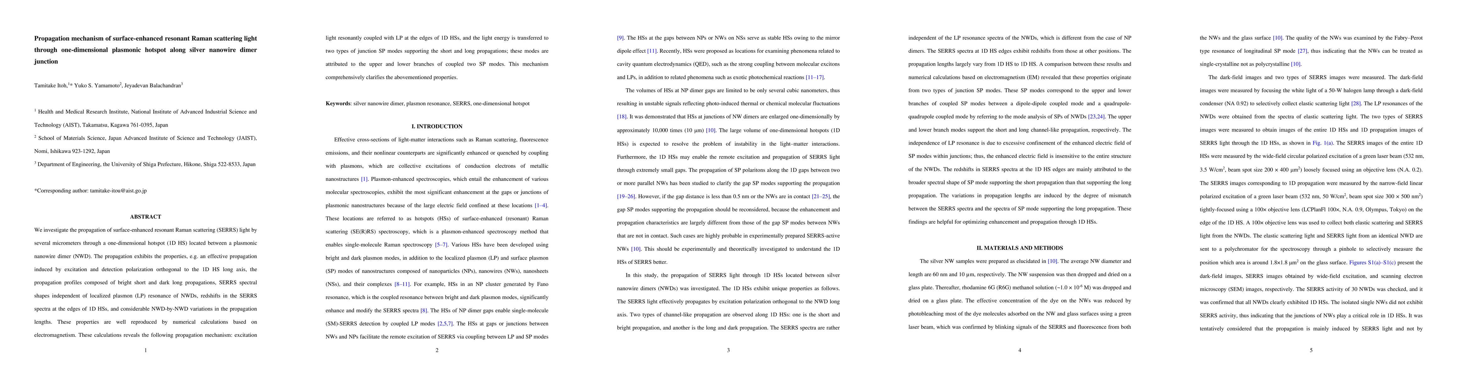 We investigate the propagation of surface-enhanced resonant Raman scattering (SERRS) light by several micrometers through a one-dimensional hotspot (1D HS) located between a plasmonic nanowire dimer (NWD). The propagation exhibits the properties, e.g. an effective propagation induced by excitation and detection polarization orthogonal to the 1D HS long axis, the propagation profiles composed of bright short and dark long propagations, SERRS spectral shapes independent of localized plasmon (LP) resonance of NWDs, redshifts in the SERRS spectra at the edges of 1D HSs, and considerable NWD-by-NWD variations in the propagation lengths. These properties are well reproduced by numerical calculations based on electromagnetism. These calculations reveals the following propagation mechanism: excitation light resonantly coupled with LP at the edges of 1D HSs, and the light energy is transferred to two types of junction SP modes supporting the short and long propagations; these modes are attributed to the upper and lower branches of coupled two SP modes. This mechanism comprehensively clarifies the abovementioned properties.