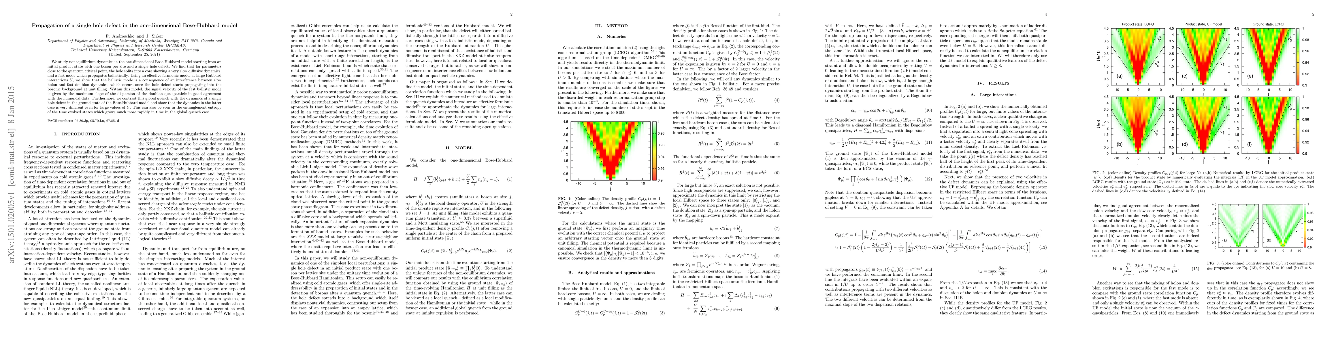 This paper investigates the nonequilibrium dynamics of a single hole defect in the one-dimensional Bose-Hubbard model, revealing ballistic propagation near the quantum critical point due to interference between holon and doublon dynamics. The study contrasts this behavior with the dynamics of a hole in the ground state, noting significant differences in entanglement entropy growth.