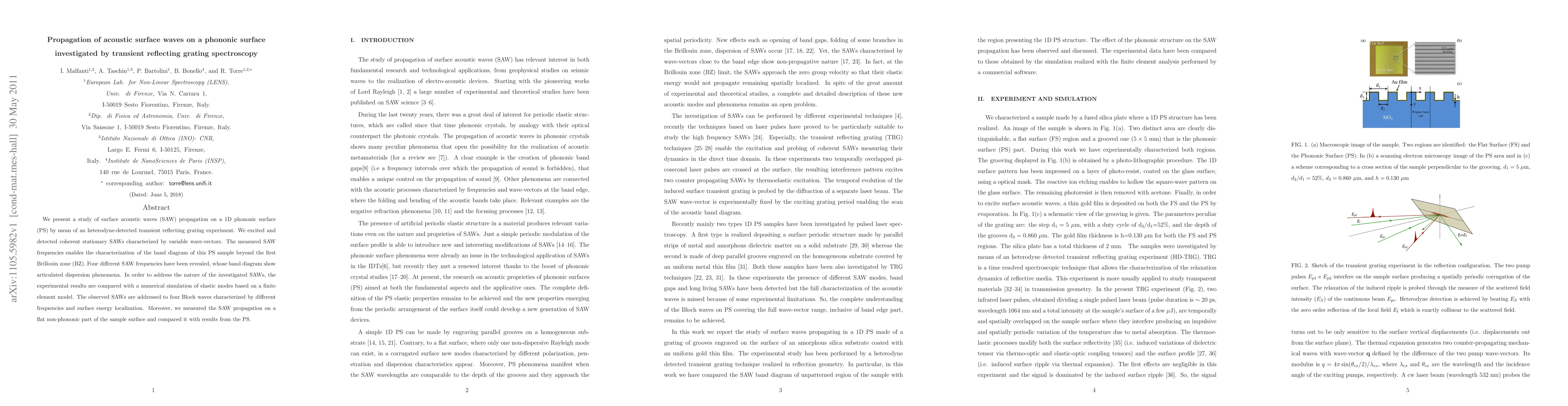 This study investigates the propagation of surface acoustic waves (SAW) on a 1D phononic surface using transient reflecting grating spectroscopy, revealing four distinct SAW frequencies and their dispersion phenomena. The findings are corroborated by numerical simulations, identifying the SAWs as Bloch waves with varied frequencies and surface energy localization.