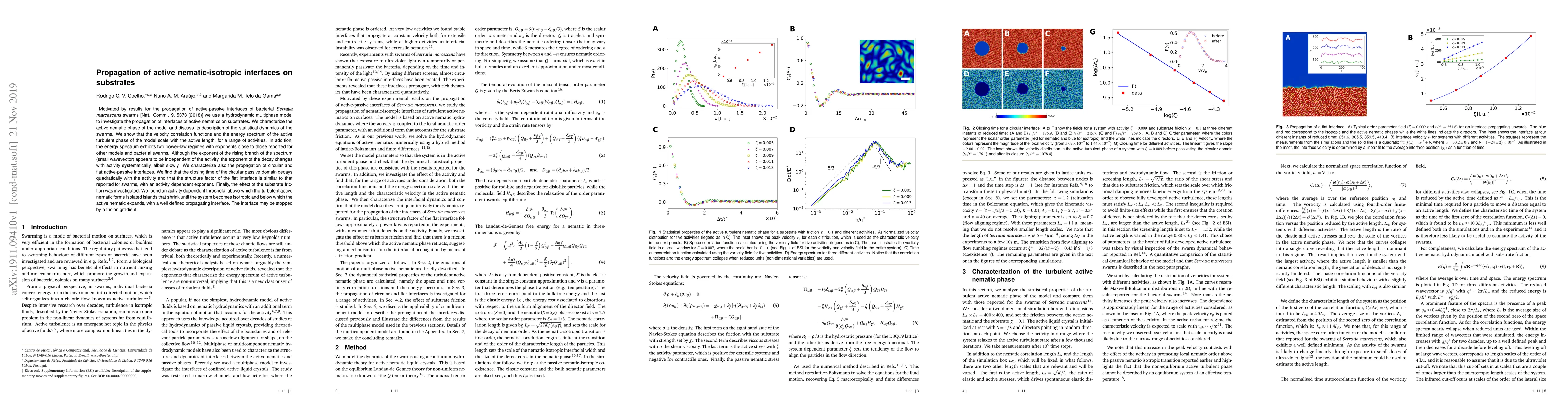 Motivated by results for the propagation of active-passive interfaces of bacterial Serratia marcescens swarms [Nat. Comm., 9, 5373 (2018)] we use a hydrodynamic multiphase model to investigate the propagation of interfaces of active nematics on substrates. We characterize the active nematic phase of the model and discuss its description of the statistical dynamics of the swarms. We show that the velocicity correlation functions and the energy spectrum of the active turbulent phase of the model scale with the active length, for a range of activities. In addition, the energy spectrum exhibits two power-law regimes with exponents close to those reported for other models and bacterial swarms. Although the exponent of the rising branch of the spectrum (small wavevector) appears to be independent of the activity, the exponent of the decay changes with activity systematically, albeit slowly. We characterize also the propagation of circular and flat active-passive interfaces. We find that the closing time of the circular passive domain decays quadratically with the activity and that the structure factor of the flat interface is similar to that reported for swarms, with an activity dependent exponent. Finally, the effect of the substrate friction was investigated. We found an activity dependent threshold, above which the turbulent active nematic forms isolated islands that shrink until the system becomes isotropic and below which the active nematic expands, with a well defined propagating interface. The interface may be stopped by a fricion gradient.