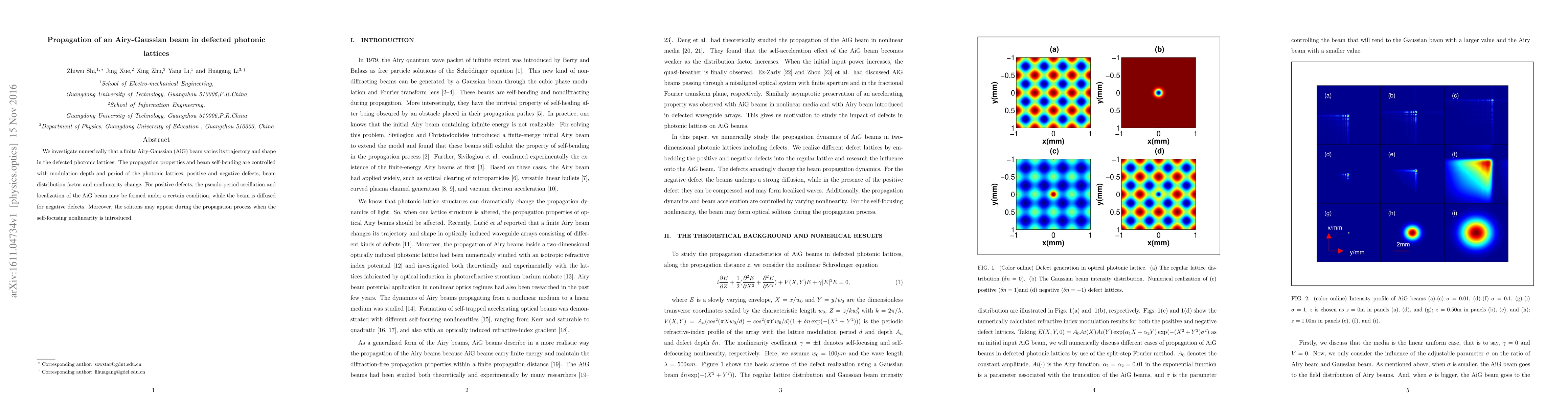 This paper numerically explores how a finite Airy-Gaussian beam's trajectory and shape change in defected photonic lattices, with control over propagation and self-bending influenced by lattice modulation depth and period, defect type, and nonlinearity. Positive defects can lead to pseudo-period oscillation and localization, while negative defects cause diffusion, and solitons may form with self-focusing nonlinearity.