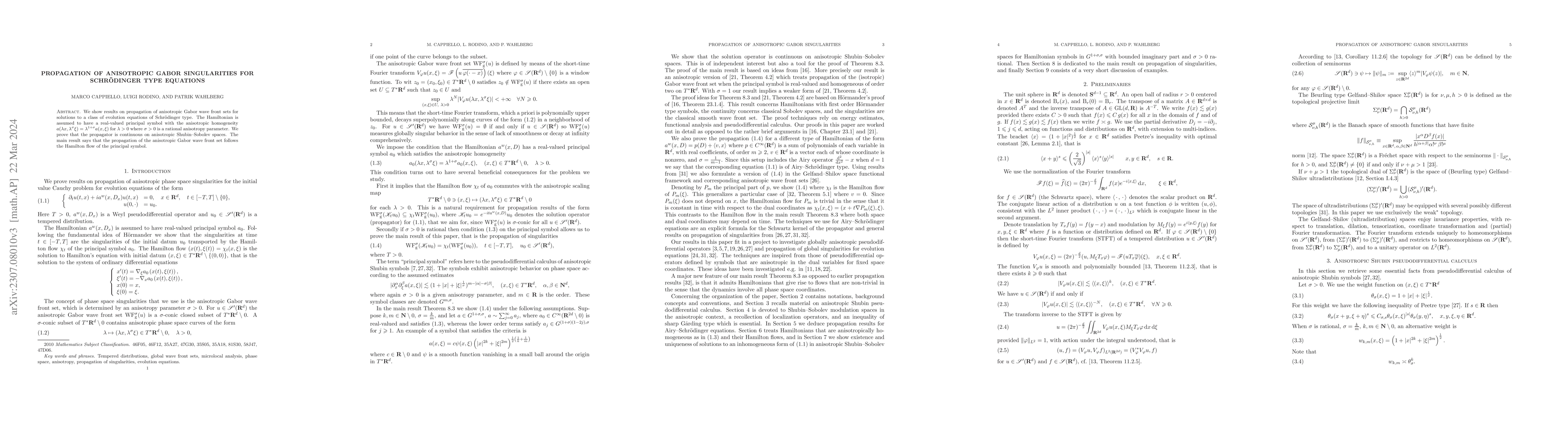 We show results on propagation of anisotropic Gabor wave front sets for solutions to a class of evolution equations of Schr\"odinger type. The Hamiltonian is assumed to have a real-valued principal symbol with the anisotropic homogeneity $a(\lambda x, \lambda^\sigma \xi) = \lambda^{1+\sigma} a(x,\xi)$ for $\lambda > 0$ where $\sigma > 0$ is a rational anisotropy parameter. We prove that the propagator is continuous on anisotropic Shubin--Sobolev spaces. The main result says that the propagation of the anisotropic Gabor wave front set follows the Hamilton flow of the principal symbol.
