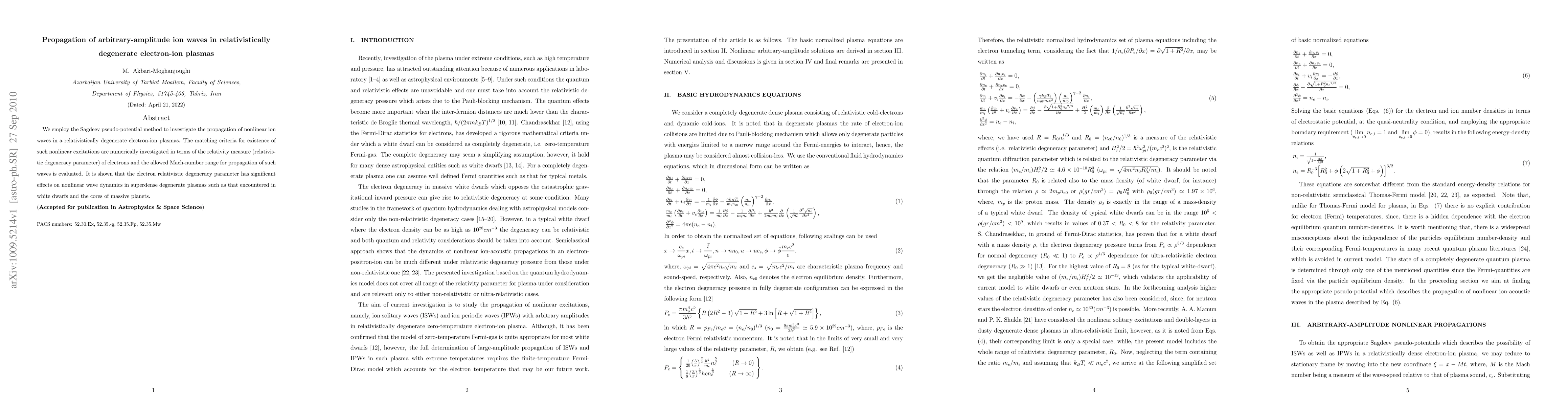 The paper presents Sagdeev pseudo-potential equations for nonlinear ion wave propagation in relativistically degenerate electron-ion plasmas, providing a critical Mach-number value for the existence of Ion Acoustic Solitary Waves and Periodic Waves.