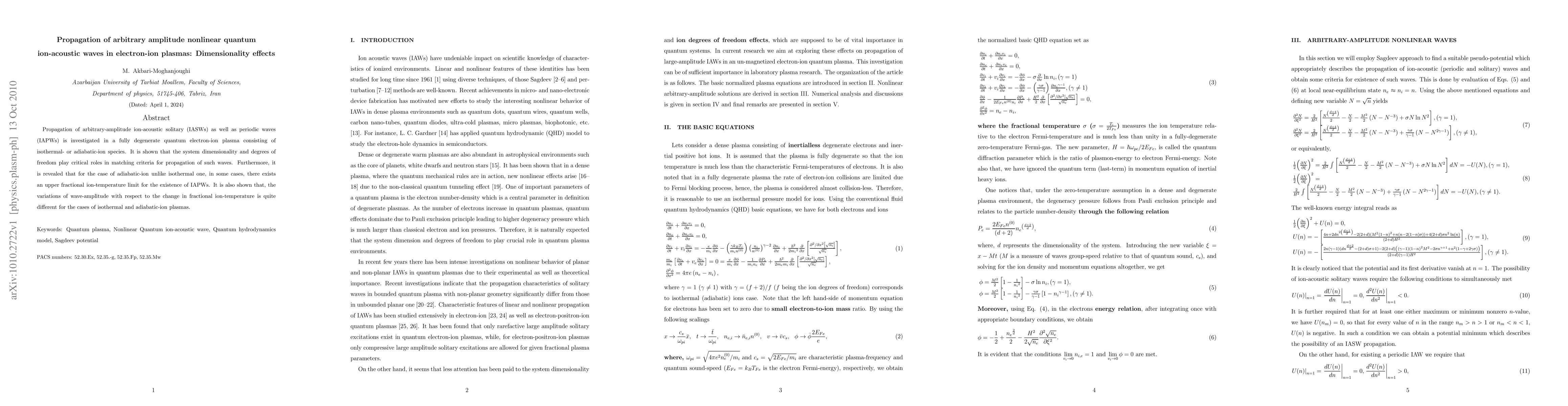 This paper investigates the propagation of nonlinear quantum ion-acoustic waves in electron-ion plasmas, highlighting the critical roles of system dimensionality and degrees of freedom in wave propagation. It also reveals that the existence of periodic ion-acoustic waves depends on the ion-temperature and differs between isothermal and adiabatic-ion plasmas.