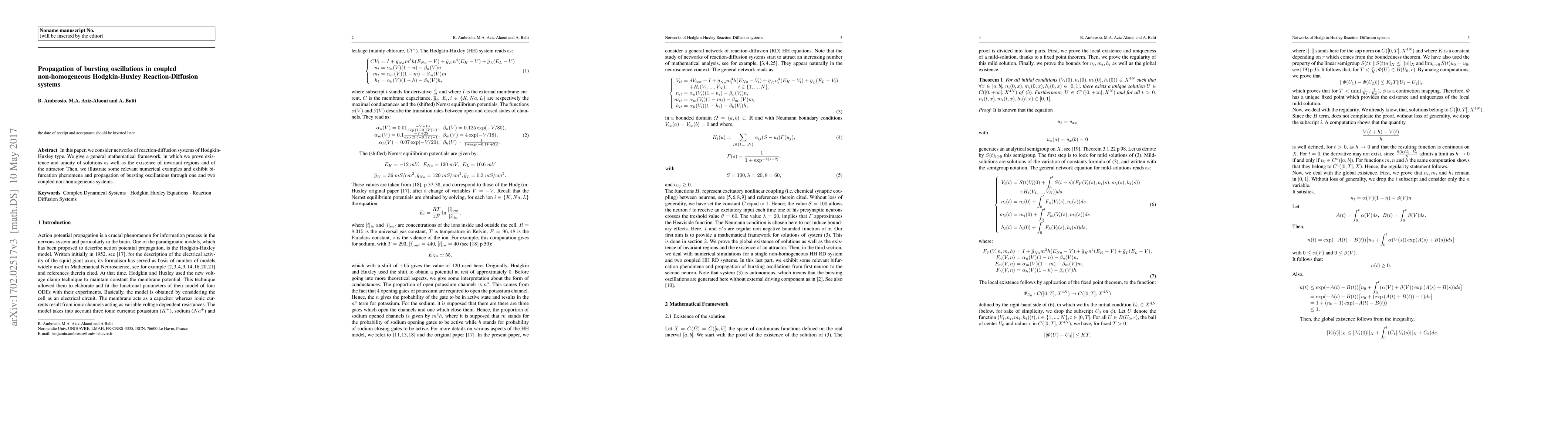 This paper develops a mathematical framework for coupled Hodgkin-Huxley reaction-diffusion systems, proving solution existence and uniqueness, and identifying invariant regions and attractors. It also demonstrates numerical examples showcasing bifurcation phenomena and the propagation of bursting oscillations in single and multiple coupled systems.