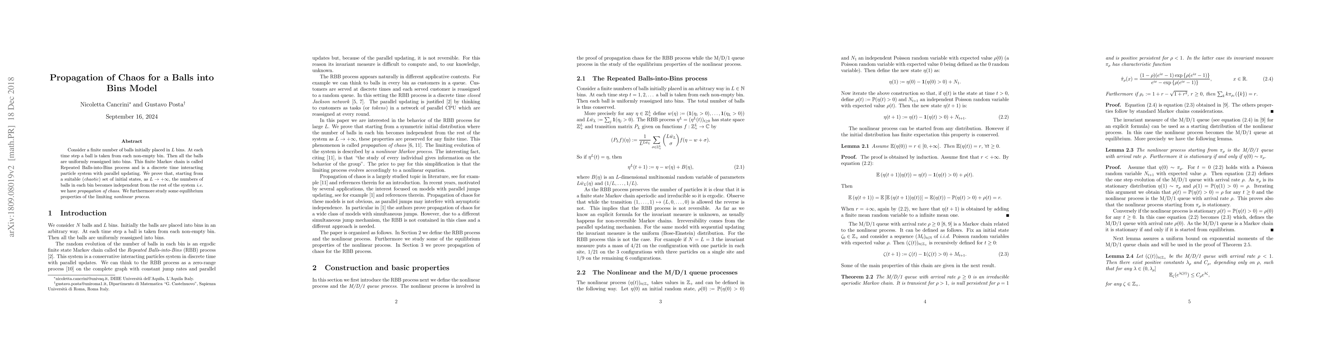 Consider a finite number of balls initially placed in $L$ bins. At each time step a ball is taken from each non-empty bin. Then all the balls are uniformly reassigned into bins. This finite Markov chain is called Repeated Balls-into-Bins process and is a discrete time interacting particle system with parallel updating. We prove that, starting from a suitable (chaotic) set of initial states, as $L\to+\infty$, the numbers of balls in each bin becomes independent from the rest of the system i.e. we have propagation of chaos. We furthermore study some equilibrium properties of the limiting nonlinear process.