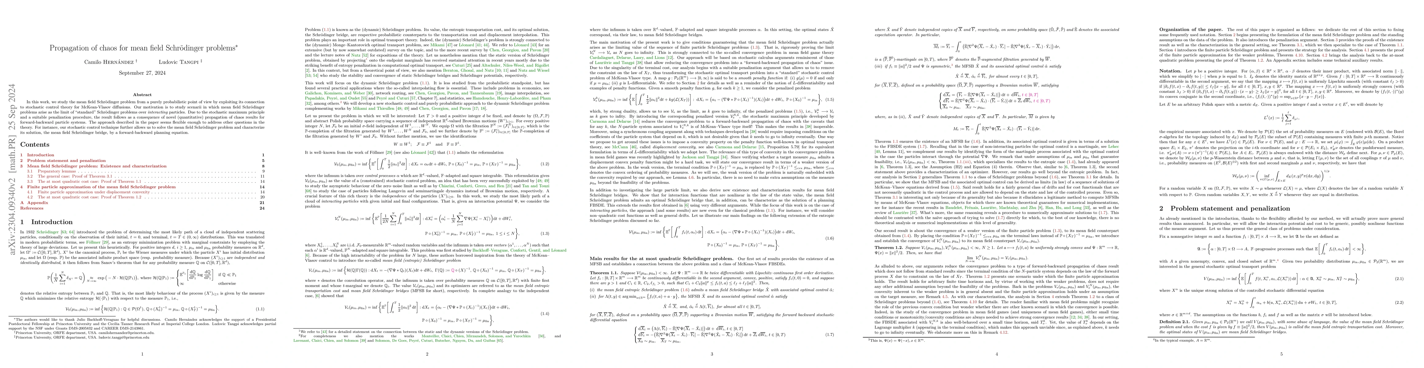In this work, we study the mean field Schr\"odinger problem from a purely probabilistic point of view by exploiting its connection to stochastic control theory for McKean-Vlasov diffusions. Our main result shows that the mean field Schr\"odinger problem arises as the limit of ``standard'' Schr\"odinger problems over interacting particles. Due to the stochastic maximum principle and a suitable penalization procedure, the result follows as a consequence of novel (quantitative) propagation of chaos results for forward-backwards particle systems. The approach described in the paper seems flexible enough to address other questions in the theory. For instance, our stochastic control technique further allows us to solve the mean field Schr\"odinger problem and characterize its solution, the mean field Schr\"odinger bridge, by a forward-backward planning equation.