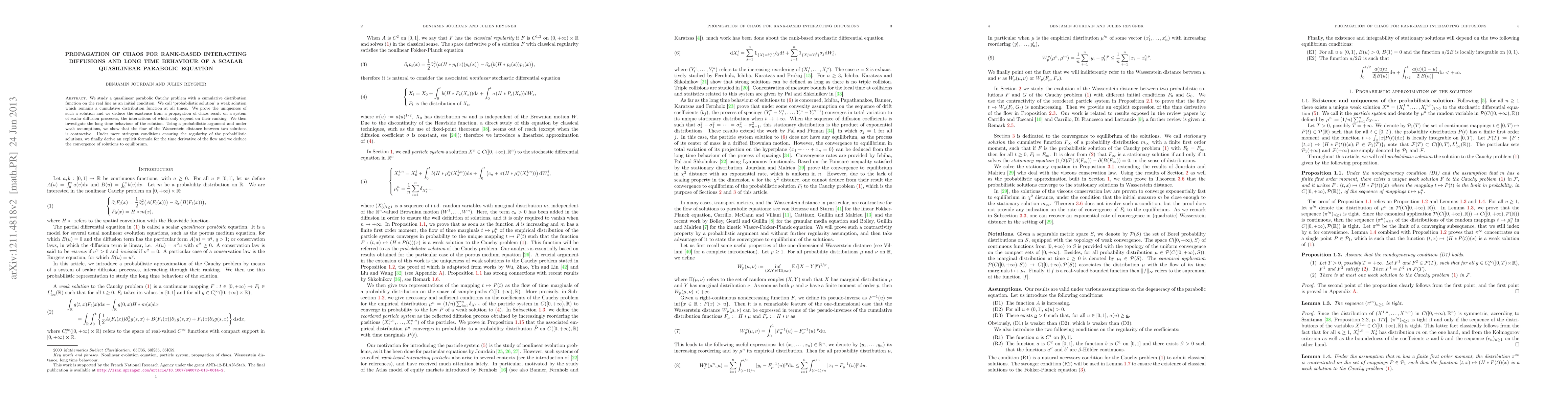 We study a quasilinear parabolic Cauchy problem with a cumulative distribution function on the real line as an initial condition. We call 'probabilistic solution' a weak solution which remains a cumulative distribution function at all times. We prove the uniqueness of such a solution and we deduce the existence from a propagation of chaos result on a system of scalar diffusion processes, the interactions of which only depend on their ranking. We then investigate the long time behaviour of the solution. Using a probabilistic argument and under weak assumptions, we show that the flow of the Wasserstein distance between two solutions is contractive. Under more stringent conditions ensuring the regularity of the probabilistic solutions, we finally derive an explicit formula for the time derivative of the flow and we deduce the convergence of solutions to equilibrium.