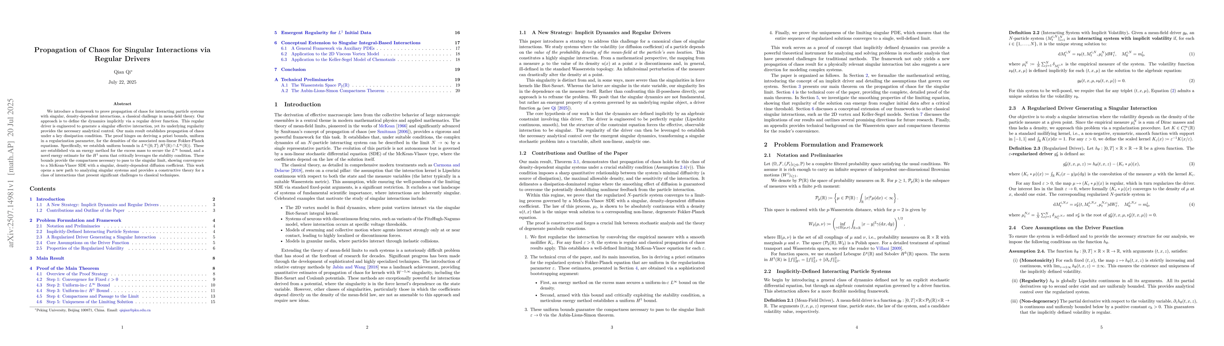 We introduce a framework to prove propagation of chaos for interacting particle systems with singular, density-dependent interactions, a classical challenge in mean-field theory. Our approach is to define the dynamics implicitly via a regular driver function. This regular driver is engineered to generate a singular effective interaction, yet its underlying regularity provides the necessary analytical control. Our main result establishes propagation of chaos under a key dissipation condition. The proof hinges on deriving a priori bounds, uniform in a regularization parameter, for the densities of the associated non-linear Fokker-Planck equations. Specifically, we establish uniform bounds in $L^\infty([0,T]; H^1(\R) \cap L^\infty(\R))$. These are established via an energy method for the excess mass to secure the $L^\infty$ bound, and a novel energy estimate for the $H^1$ norm that critically leverages the stability condition. These bounds provide the compactness necessary to pass to the singular limit, showing convergence to a McKean-Vlasov SDE with a singular, density-dependent diffusion coefficient. This work opens a new path to analyzing singular systems and provides a constructive theory for a class of interactions that present significant challenges to classical techniques.