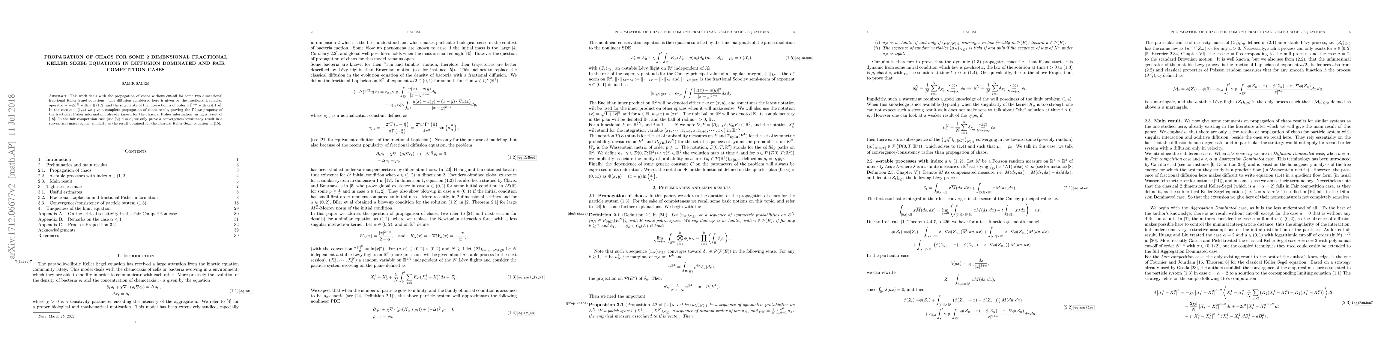 In this work we deal with the local in time propagation of chaos without cut-off for some two dimensional fractional Keller Segel equations. More precisely the diffusion considered here is given by the fractional Laplacian operator $-(-\Delta)^{\frac{a}{2}}$ with $a \in (1,2)$ and the singularity of the interaction is of order $|x|^{1-\alpha}$ with $\alpha\in ]1,a]$. In the case $\alpha\in (1,a)$ we give a complete propagation of chaos result, proving the $\Gamma$-l.s.c property of the fractional Fisher information, already known for the classical Fisher information, using a result of Mischler and Hauray. In the fair competition case $a=\alpha$, we only prove a convergence/consistency result in a sub-critical mass regime, similarly as the result obtained for the classical Keller-Segel equation.
