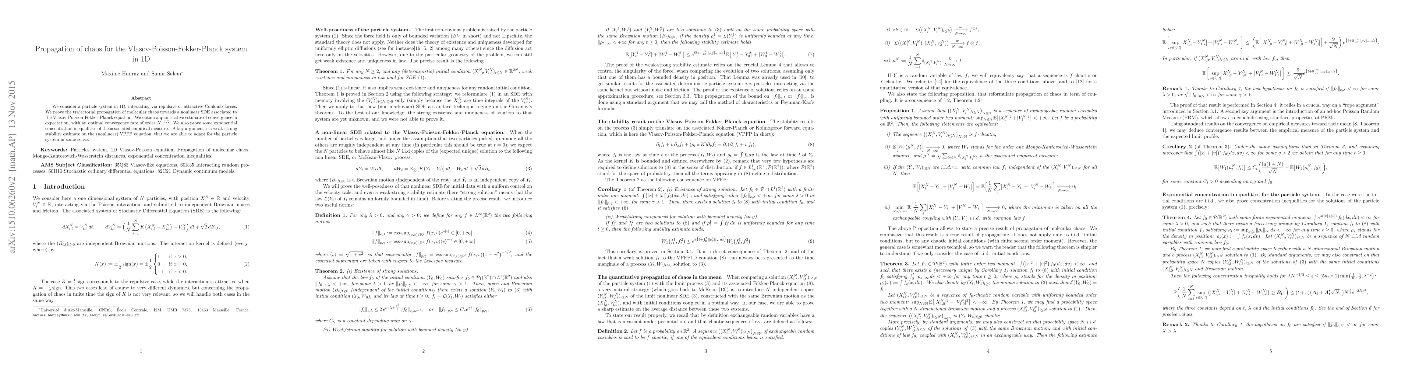 This paper proves the trajectorial propagation of molecular chaos for a 1D particle system interacting via Coulomb forces, showing convergence to a nonlinear SDE associated with the Vlasov-Poisson-Fokker-Planck equation with an optimal rate of $N^{-1/2}$. It also establishes exponential concentration inequalities for the empirical measures.