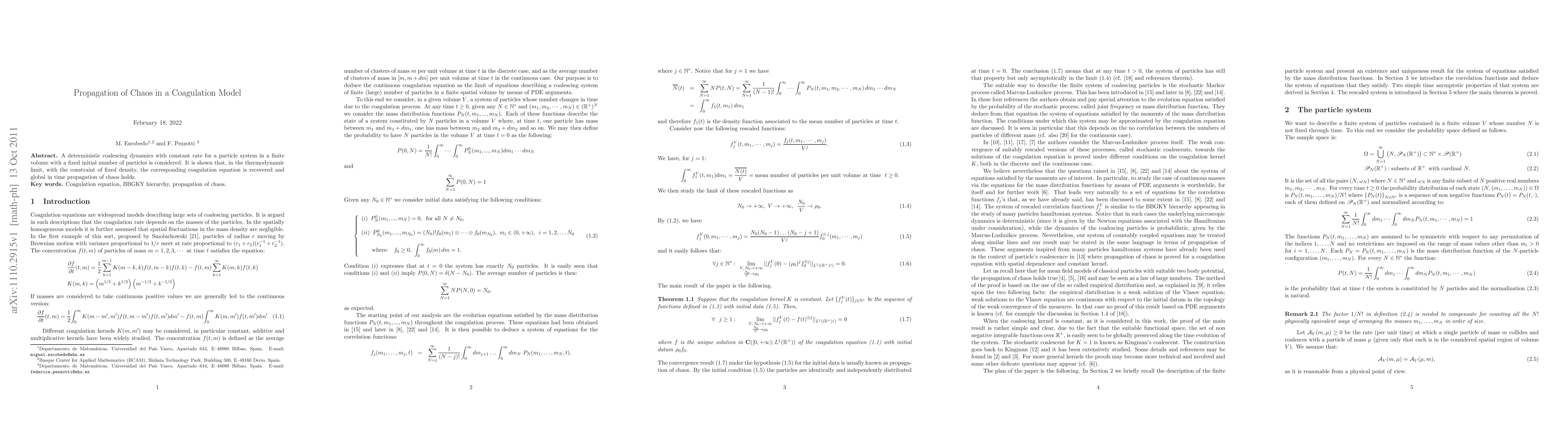 A deterministic coalescing dynamics with constant rate for a particle system in a finite volume with a fixed initial number of particles is considered. It is shown that, in the thermodynamic limit, with the constraint of fixed density, the corresponding coagulation equation is recovered and global in time propagation of chaos holds.