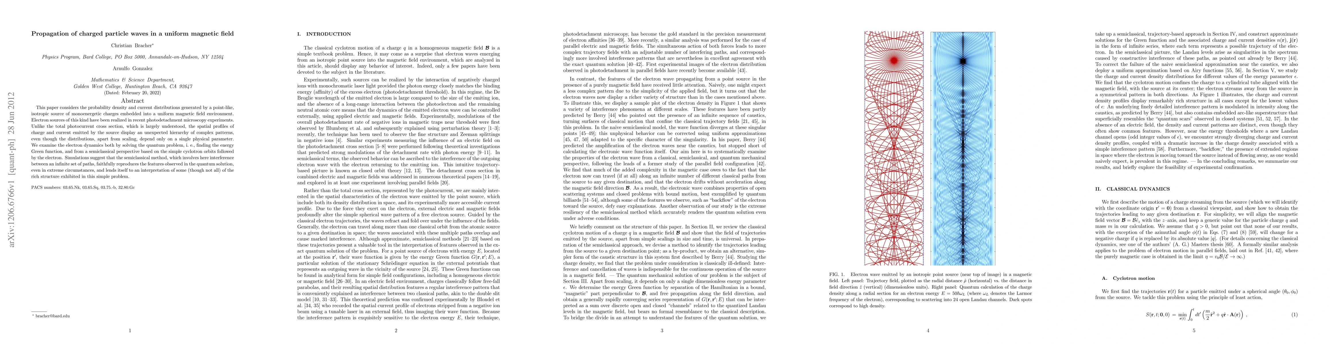 This paper considers the probability density and current distributions generated by a point-like, isotropic source of monoenergetic charges embedded into a uniform magnetic field environment. Electron sources of this kind have been realized in recent photodetachment microscopy experiments. Unlike the total photocurrent cross section, which is largely understood, the spatial profiles of charge and current emitted by the source display an unexpected hierarchy of complex patterns, even though the distributions, apart from scaling, depend only on a single physical parameter. We examine the electron dynamics both by solving the quantum problem, i. e., finding the energy Green function, and from a semiclassical perspective based on the simple cyclotron orbits followed by the electron. Simulations suggest that the semiclassical method, which involves here interference between an infinite set of paths, faithfully reproduces the features observed in the quantum solution, even in extreme circumstances, and lends itself to an interpretation of some (though not all) of the rich structure exhibited in this simple problem.