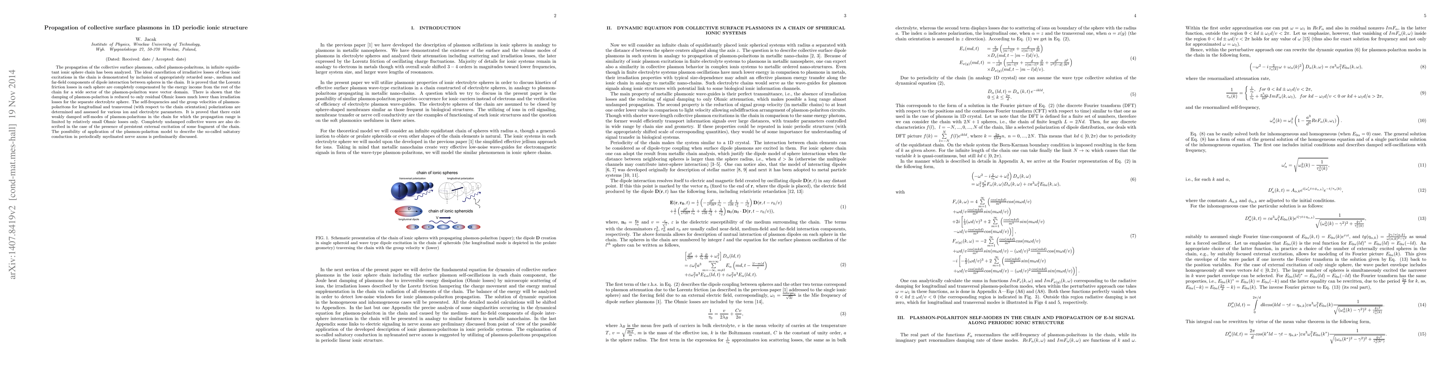 The propagation of the collective surface plasmons, called plasmon-polaritons, in infinite equidistant ionic sphere chain has been analyzed. The ideal cancellation of irradiative losses of these ionic excitations in the chain is demonstrated by inclusion of appropriately retarded near-, medium and far-field components of dipole interaction between spheres in the chain. It is proved that the Lorentz friction losses in each sphere are completely compensated by the energy income from the rest of the chain for a wide sector of the plasmon-polariton wave vector domain. There is shown that the damping of plasmon-polariton is reduced to only residual Ohmic losses much lower than irradiation losses for the separate electrolyte sphere. The self-frequencies and the group velocities of plasmon-polaritons for longitudinal and transversal (with respect to the chain orientation) polarizations are determined and assessed for various ion and electrolyte parameters. It is proved that there exist weakly damped self-modes of plasmon-polaritons in the chain for which the propagation range is limited by relatively small Ohmic losses only. Completely undamped collective waves are also described in the case of the presence of persistent external excitation of some fragment of the chain. The possibility of application of the plasmon-polariton model to describe the so-called saltatory conduction in periodically myelinated nerve axons is preliminarily discussed.