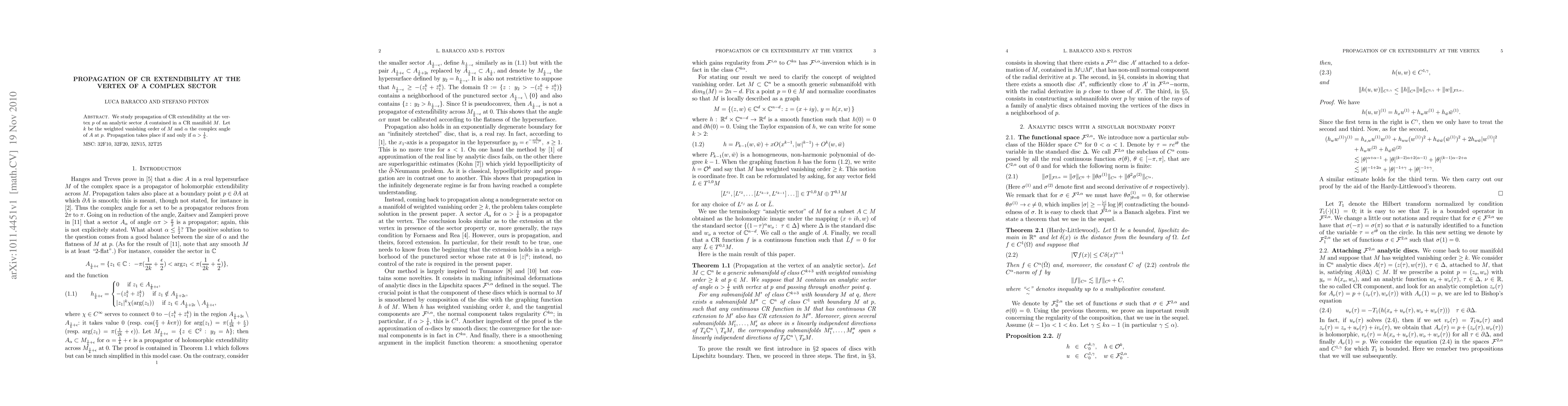 We study propagation of CR extendibility at the vertex $p$ of an analytic sector $A$ contained in a CR manifold $M$. Let $k$ be the weighted vanishing order of $M$ and $\alpha $ the complex angle of $A$ at $p$. Propagation takes place if and only if $\alpha>\frac1k$.