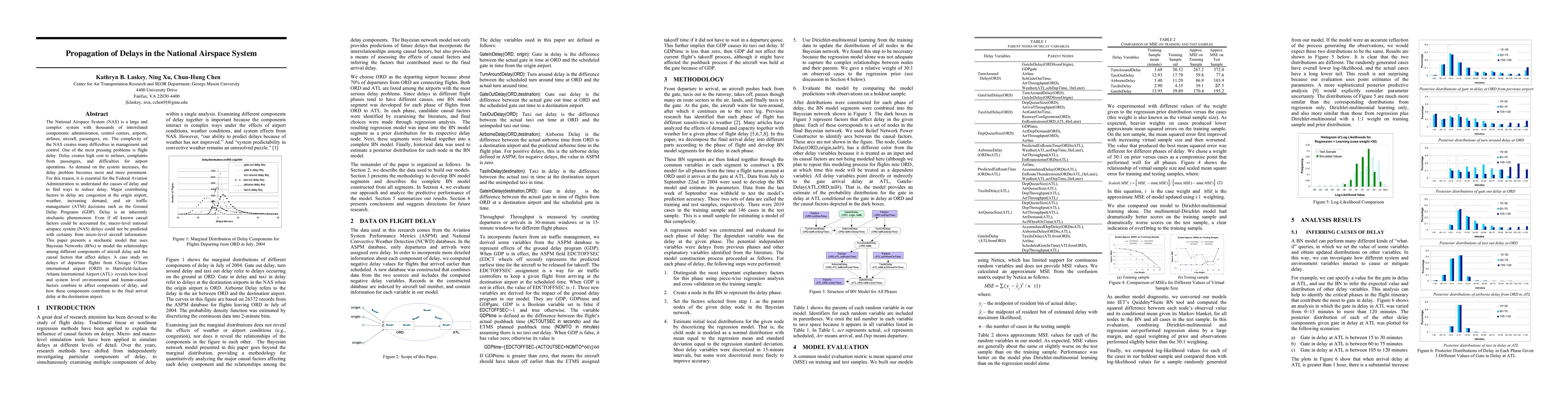 The National Airspace System (NAS) is a large and complex system with thousands of interrelated components: administration, control centers, airports, airlines, aircraft, passengers, etc. The complexity of the NAS creates many difficulties in management and control. One of the most pressing problems is flight delay. Delay creates high cost to airlines, complaints from passengers, and difficulties for airport operations. As demand on the system increases, the delay problem becomes more and more prominent. For this reason, it is essential for the Federal Aviation Administration to understand the causes of delay and to find ways to reduce delay. Major contributing factors to delay are congestion at the origin airport, weather, increasing demand, and air traffic management (ATM) decisions such as the Ground Delay Programs (GDP). Delay is an inherently stochastic phenomenon. Even if all known causal factors could be accounted for, macro-level national airspace system (NAS) delays could not be predicted with certainty from micro-level aircraft information. This paper presents a stochastic model that uses Bayesian Networks (BNs) to model the relationships among different components of aircraft delay and the causal factors that affect delays. A case study on delays of departure flights from Chicago O'Hare international airport (ORD) to Hartsfield-Jackson Atlanta International Airport (ATL) reveals how local and system level environmental and human-caused factors combine to affect components of delay, and how these components contribute to the final arrival delay at the destination airport.