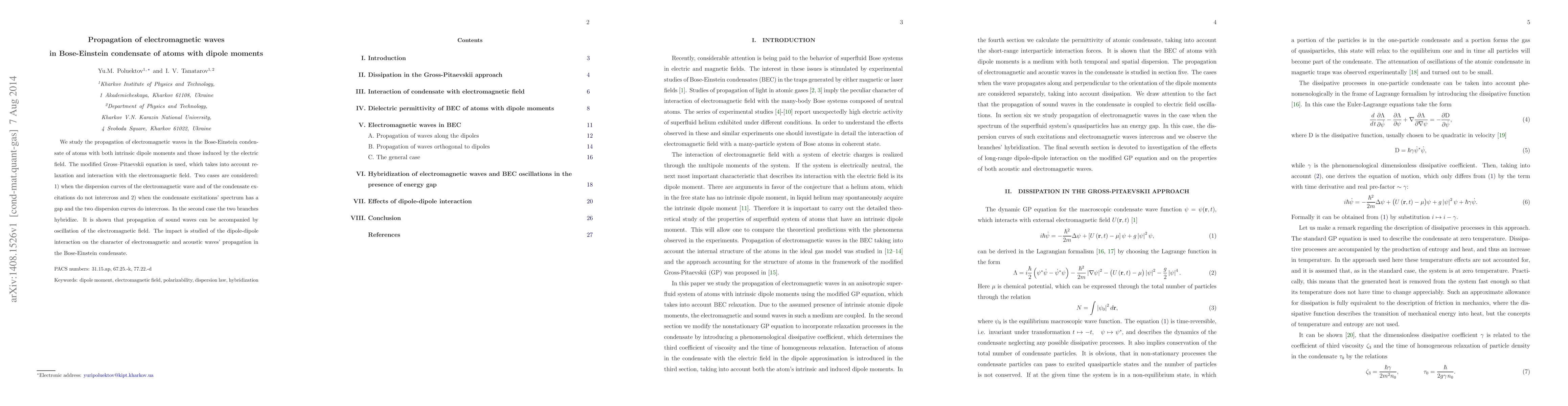 This paper investigates electromagnetic wave propagation in Bose-Einstein condensates with intrinsic and induced dipole moments, using a modified Gross-Pitaevskii equation. It explores two scenarios: non-intersecting dispersion curves and hybridization when curves intersect, revealing the influence of dipole-dipole interactions on wave propagation.