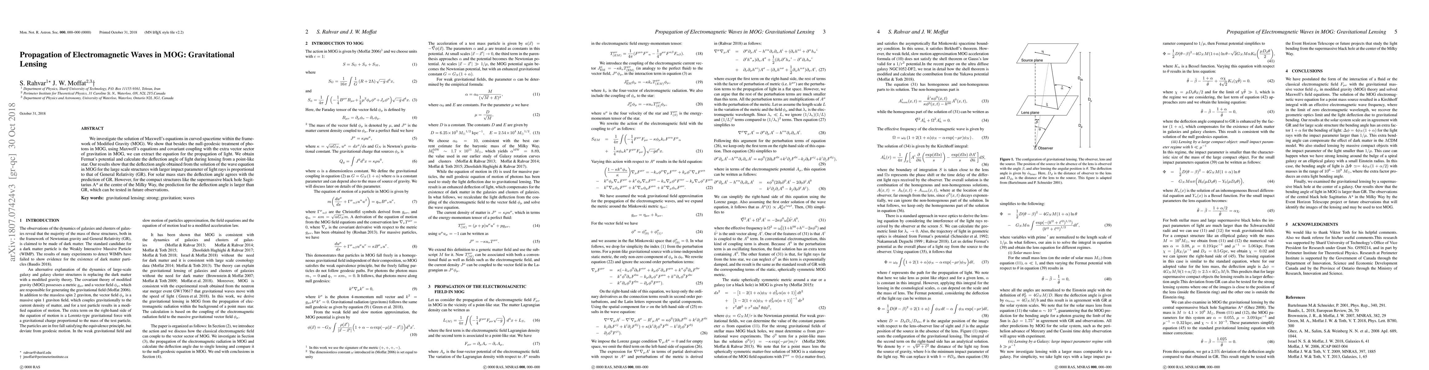 This research derives the propagation equation for electromagnetic waves in Modified Gravity (MOG), showing that for large-scale structures, the deflection angle aligns with General Relativity (GR). For compact structures like supermassive black holes, MOG predicts a larger deflection angle, which could be tested with future observations.