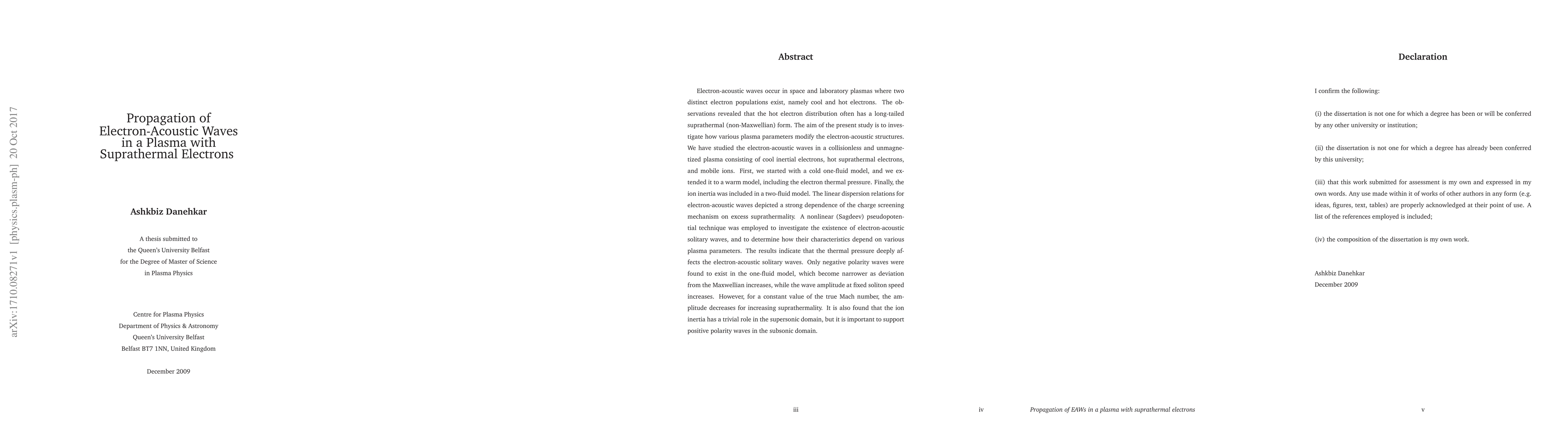 This study examines electron-acoustic waves in a plasma with distinct cool and suprathermal hot electron populations. The research finds that thermal pressure strongly influences these waves, with negative polarity solitary waves becoming narrower and increasing in amplitude as suprathermality rises, while ion inertia is significant only in supporting positive polarity waves in subsonic domains.