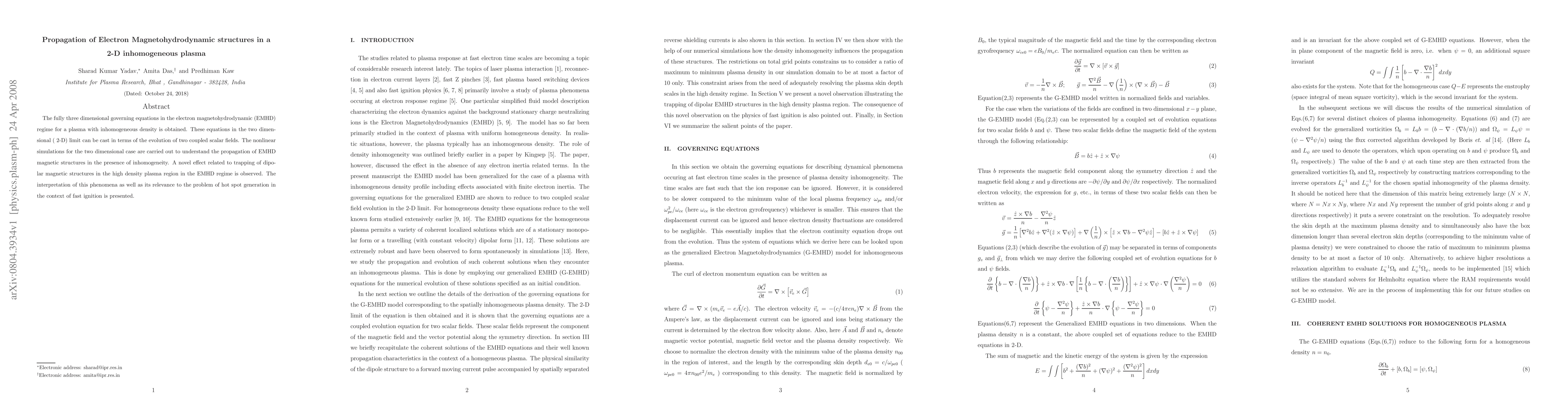 The fully three dimensional governing equations in the electron magnetohydrodynamic (EMHD) regime for a plasma with inhomogeneous density is obtained. These equations in the two dimensional (2-D) limit can be cast in terms of the evolution of two coupled scalar fields. The nonlinear simulations for the two dimensional case are carried out to understand the propagation of EMHD magnetic structures in the presence of inhomogeneity. A novel effect related to trapping of dipolar magnetic structures in the high density plasma region in the EMHD regime is observed. The interpretation of this phenomena as well as its relevance to the problem of hot spot generation in the context of fast ignition is presented.