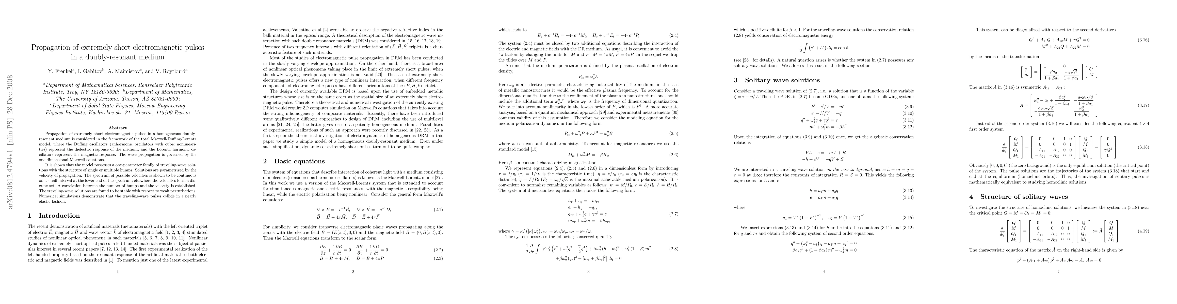 This paper explores the propagation of ultra-short electromagnetic pulses in a doubly-resonant medium using a Maxwell-Duffing-Lorentz model, revealing continuous and discrete velocity spectra for traveling-wave solutions, and demonstrating their stability and nearly elastic collision behavior.