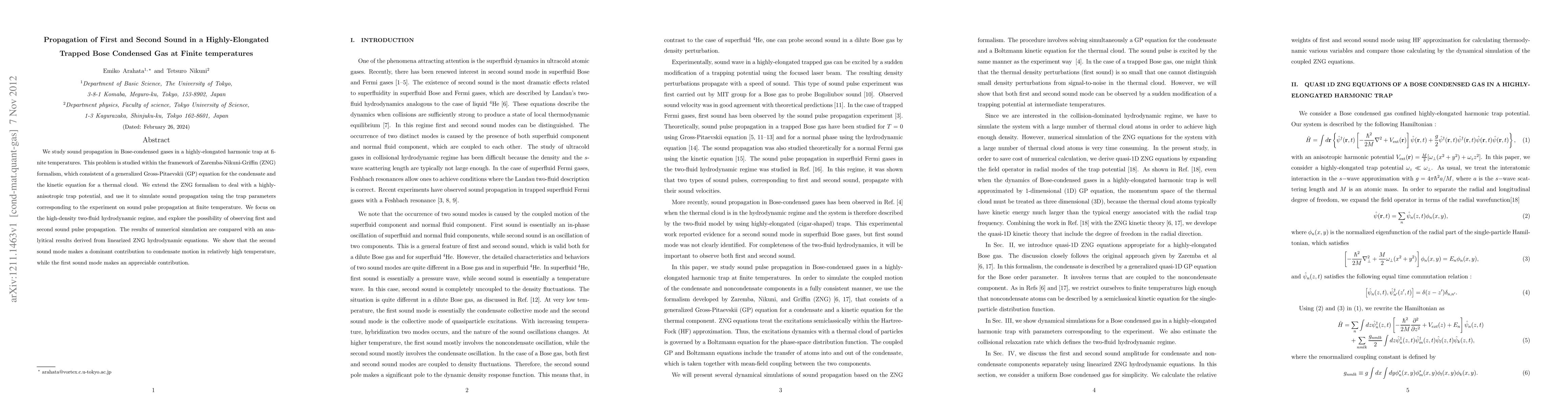 This paper investigates the propagation of first and second sound in highly-elongated trapped Bose-condensed gases at finite temperatures using the Zaremba-Nikuni-Griffin formalism. The study reveals that second sound dominates condensate motion at higher temperatures, while first sound also plays a significant role.