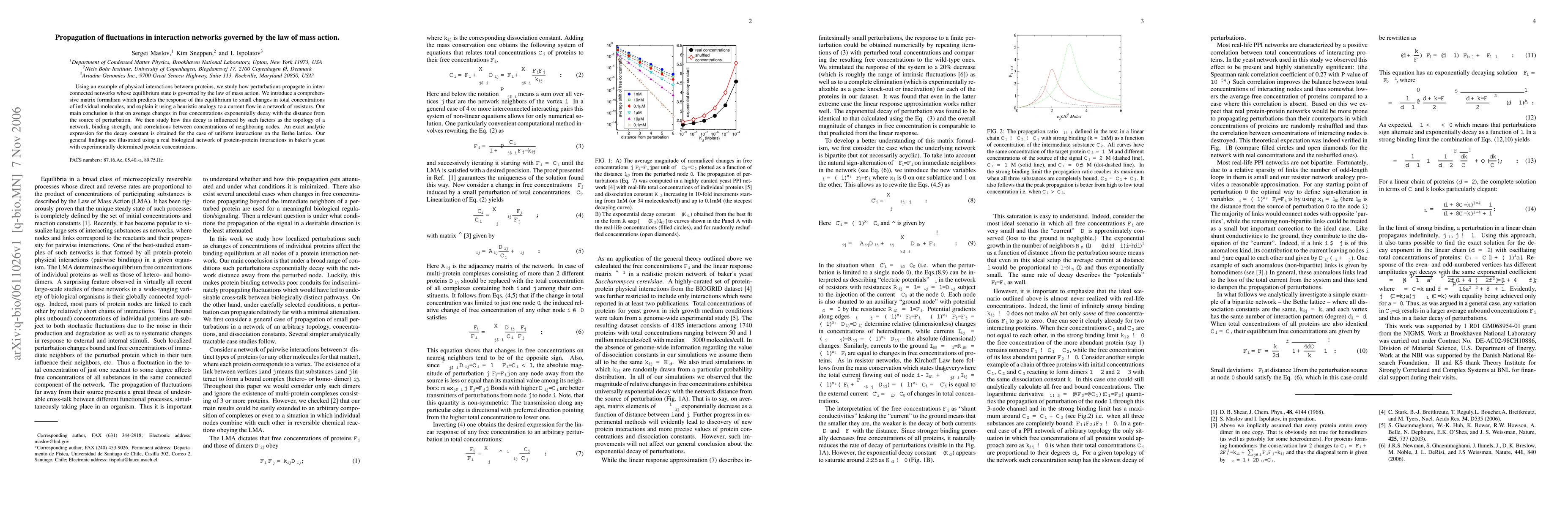 Using an example of physical interactions between proteins, we study how perturbations propagate in interconnected networks whose equilibrium state is governed by the law of mass action. We introduce a comprehensive matrix formalism which predicts the response of this equilibrium to small changes in total concentrations of individual molecules, and explain it using a heuristic analogy to a current flow in a network of resistors. Our main conclusion is that on average changes in free concentrations exponentially decay with the distance from the source of perturbation. We then study how this decay is influenced by such factors as the topology of a network, binding strength, and correlations between concentrations of neighboring nodes. An exact analytic expression for the decay constant is obtained for the case of uniform interactions on the Bethe lattice. Our general findings are illustrated using a real biological network of protein-protein interactions in baker's yeast with experimentally determined protein concentrations.