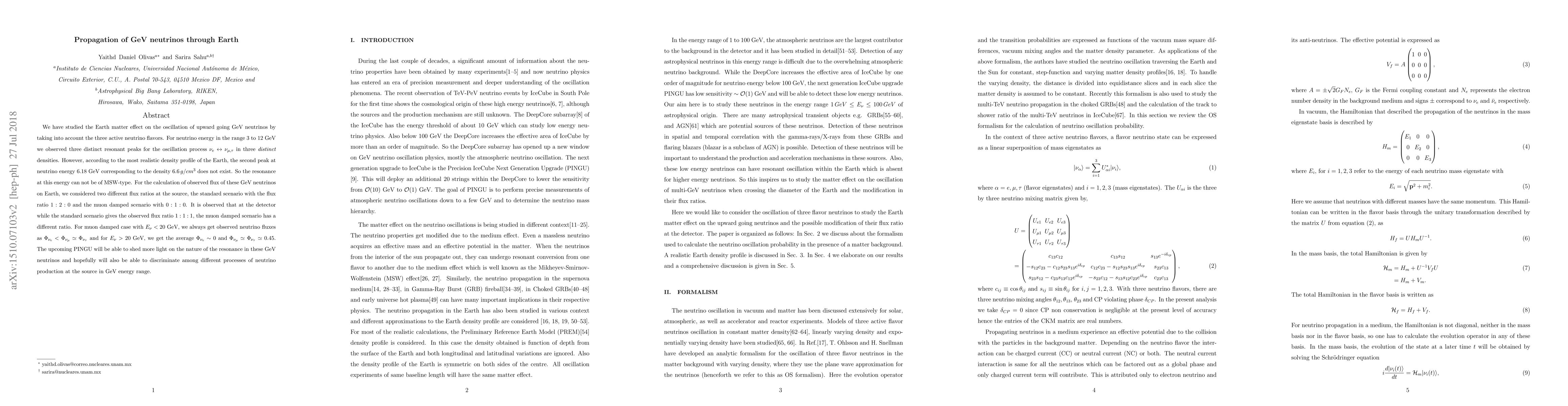 This study investigates the oscillation of GeV neutrinos through Earth, revealing three distinct resonant peaks for $\nu_e\leftrightarrow \nu_{\mu,\tau}$ oscillations at varying densities. The second peak at 6.18 GeV does not exist according to the Earth's realistic density profile, ruling out an MSW-type resonance. The observed neutrino flux ratios vary significantly between standard and muon-damped scenarios, with PINGU potentially clarifying these resonances and production processes.