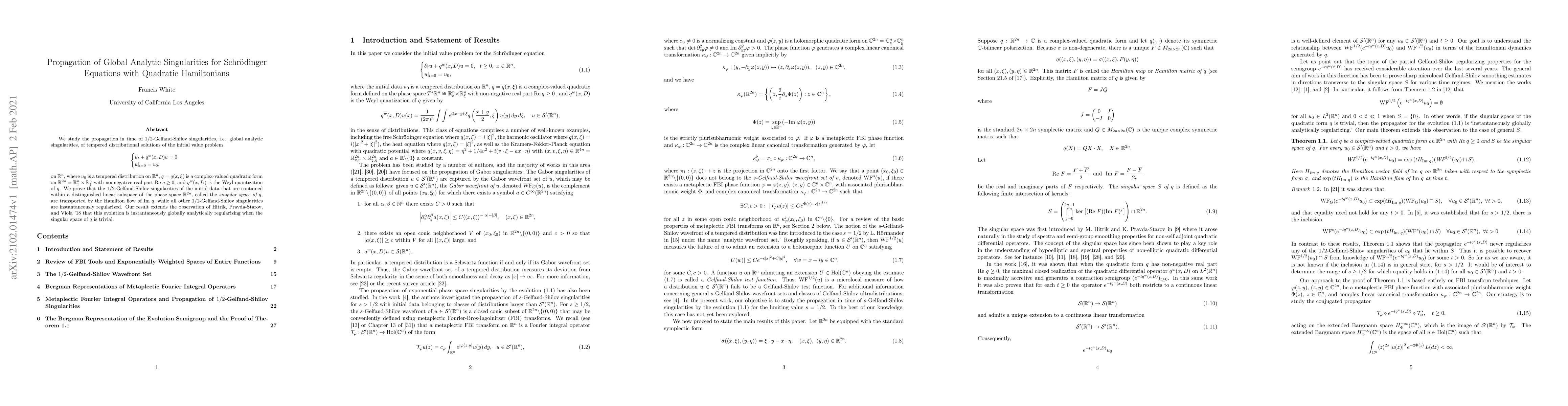 This paper investigates the time evolution of $1/2$-Gelfand-Shilov singularities in solutions to Schrödinger equations with quadratic Hamiltonians, showing that singularities within a specific phase space subspace are transported by the Hamiltonian flow, while others are immediately regularized. This extends prior results on globally analytic regularization.