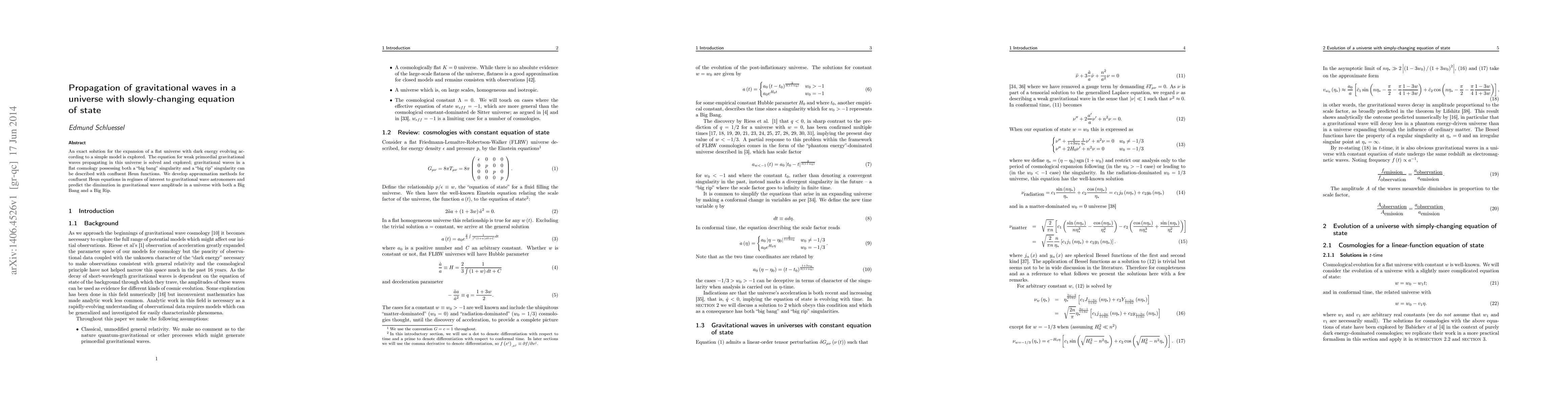 An exact solution for the expansion of a flat universe with dark energy evolving according to a simple model is explored. The equation for weak primordial gravitational waves propagating in this universe is solved and explored; gravitational waves in a flat cosmology possessing both a "big bang" singularity and a "big rip" singularity can be described with confluent Heun functions. We develop approximation methods for confluent Heun equations in regimes of interest to gravitational wave astronomers and predict the diminution in gravitational wave amplitude in a universe with both a Big Bang and a Big Rip.
