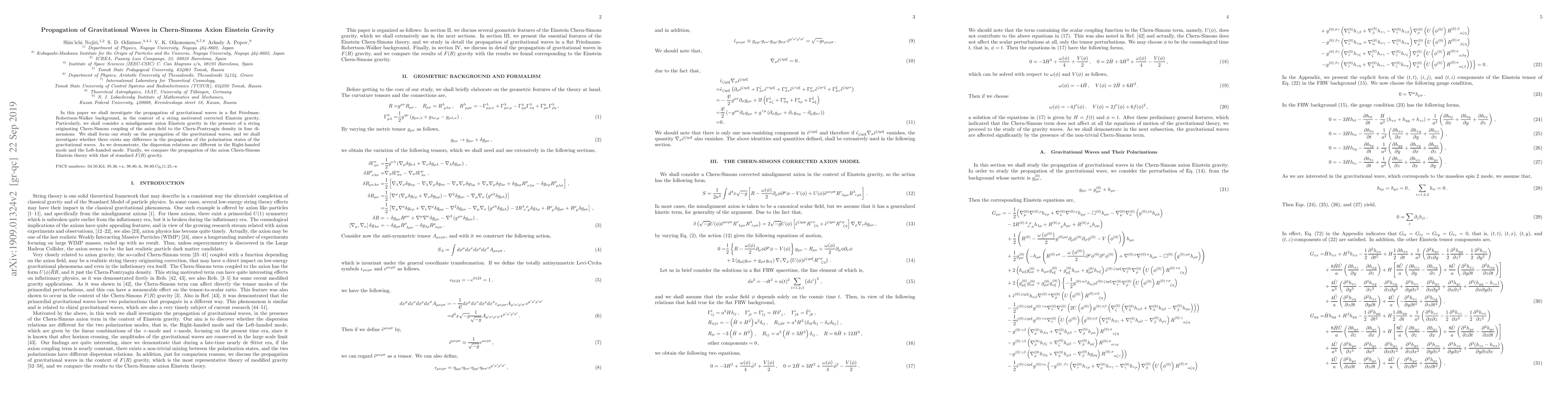In this paper we shall investigate the propagation of gravitational waves in a flat Friedman-Robertson-Walker background, in the context of a string motivated corrected Einstein gravity. Particularly, we shall consider a misalignment axion Einstein gravity in the presence of a string originating Chern-Simons coupling of the axion field to the Chern-Pontryagin density in four dimensions. We shall focus our study on the propagation of the gravitational waves, and we shall investigate whether there exists any difference in the propagation of the polarization states of the gravitational waves. As we demonstrate, the dispersion relations are different in the Right-handed mode and the Left-handed mode. Finally, we compare the propagation of the axion Chern-Simons Einstein theory with that of standard $F(R)$ gravity.
