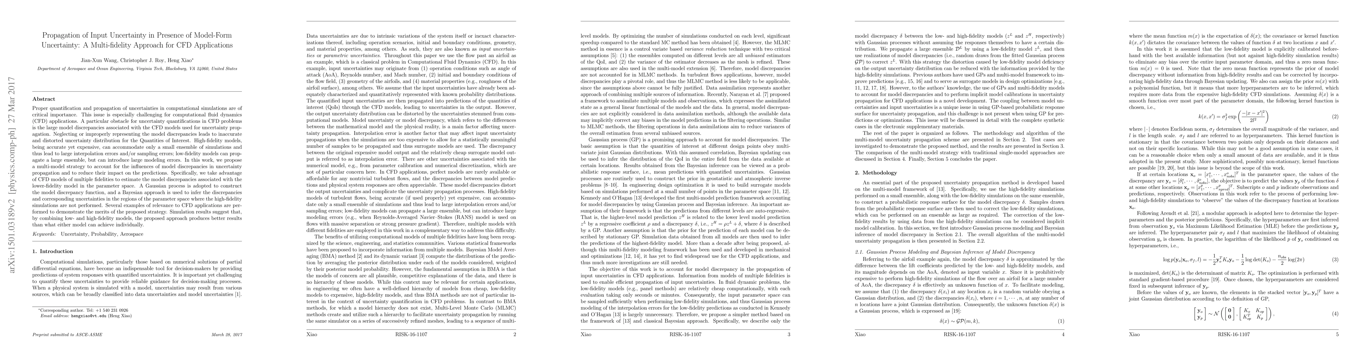 This paper proposes a multi-fidelity approach to quantify and propagate uncertainties in computational fluid dynamics (CFD) simulations, addressing the challenges posed by model discrepancies. It combines low-fidelity models for large ensemble simulations with high-fidelity models for accurate predictions, using Gaussian processes and Bayesian inference to estimate model discrepancies and improve uncertainty quantification.