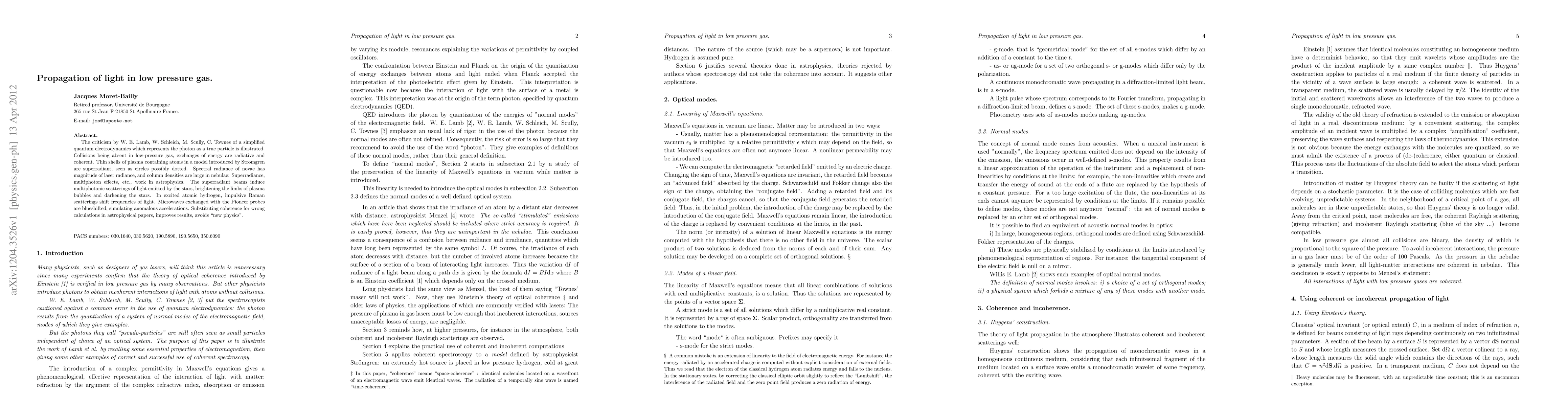 The criticism by W. E. Lamb, W. Schleich, M. Scully, C. Townes of a simplified quantum electrodynamics which represents the photon as a true particle is illustrated. Collisions being absent in low-pressure gas, exchanges of energy are radiative and coherent. Thin shells of plasma containing atoms in a model introduced by Str\"omgren are superradiant, seen as circles possibly dotted. Spectral radiance of novae has magnitude of laser radiance, and column densities are large in nebulae: Superradiance, multiphoton effects, etc., work in astrophysics. The superradiant beams induce multiphotonic scatterings of light emitted by the stars, brightening the limbs of plasma bubbles and darkening the stars. In excited atomic hydrogen, impulsive Raman scatterings shift frequencies of light. Microwaves exchanged with the Pioneer probes are blueshifted, simulating anomalous accelerations. Substituting coherence for wrong calculations in astrophysical papers, improves results, avoids "new physics".