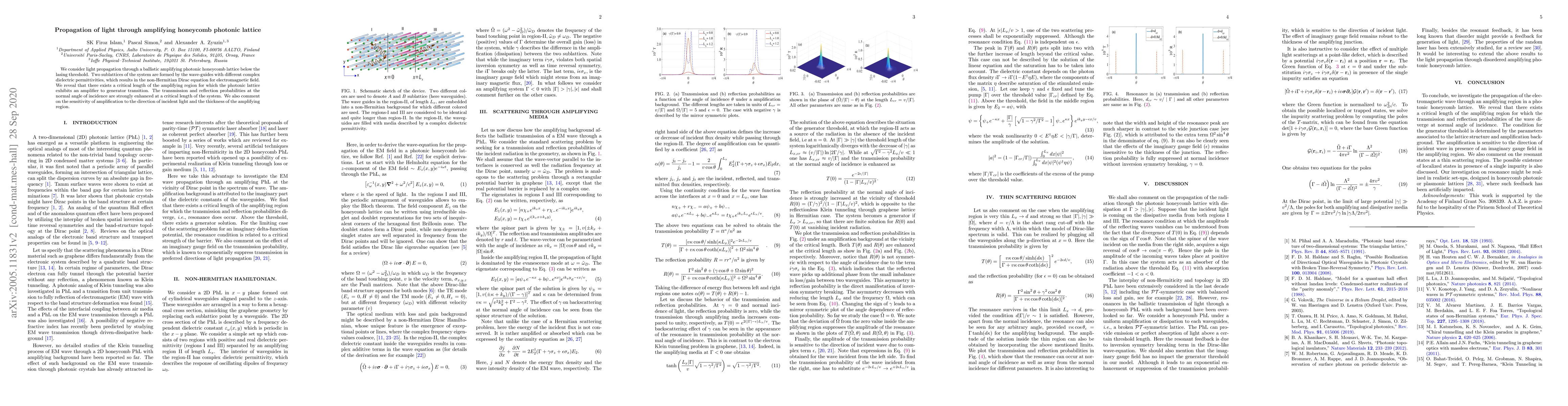 We consider light propagation through a ballistic amplifying photonic honeycomb lattice below the lasing threshold. Two sublattices of the system are formed by the wave-guides with different complex dielectric permittivities, which results in the non-Hermitian Dirac equation for electromagnetic field. We reveal that there exists a critical length of the amplifying region for which the photonic lattice exhibits an amplifier to generator transition. The transmission and reflection probabilities at the normal angle of incidence are strongly enhanced at a critical length of the system. We also comment on the sensitivity of amplification to the direction of incident light and the thickness of the amplifying region.