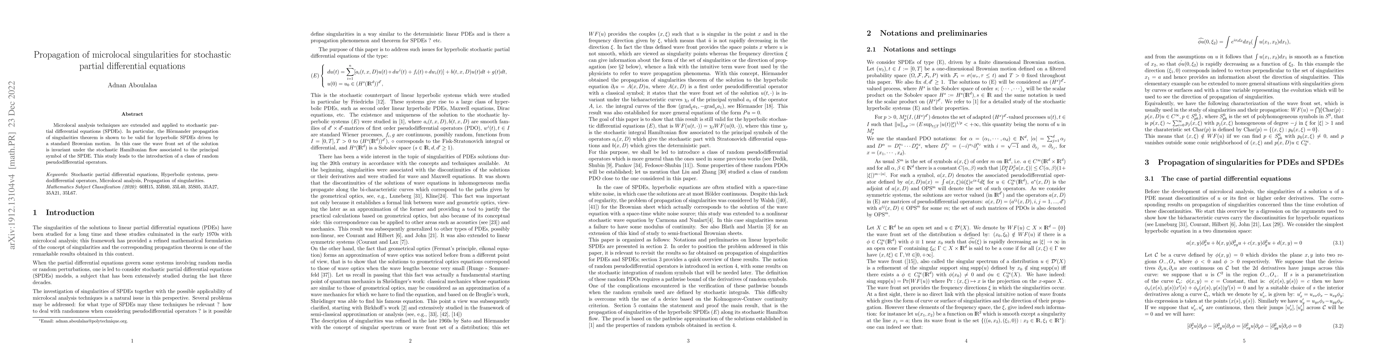 This paper extends microlocal analysis to stochastic partial differential equations (SPDEs), demonstrating the validity of H\"ormander's propagation theorem for hyperbolic SPDEs driven by Brownian motion. It introduces random pseudodifferential operators and shows the invariance of the wave front set under the stochastic Hamiltonian flow.