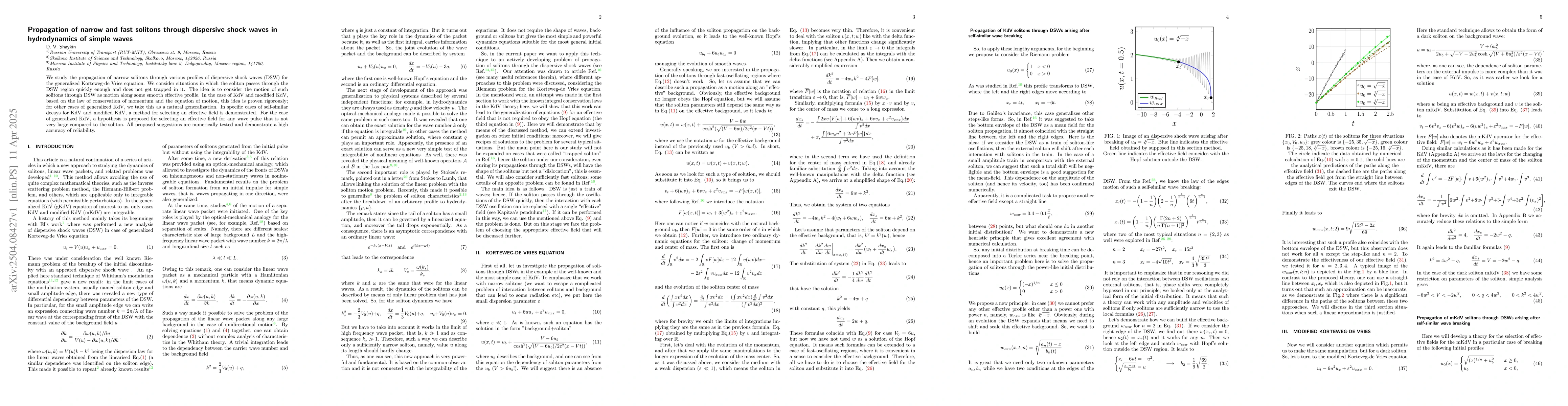 The research examines the propagation of narrow and fast solitons through dispersive shock waves (DSW) in hydrodynamics, focusing on the generalized Korteweg-de Vries (KdV) equation. The study considers solitons moving quickly through DSW regions without getting trapped, proposing an effective field motion concept.